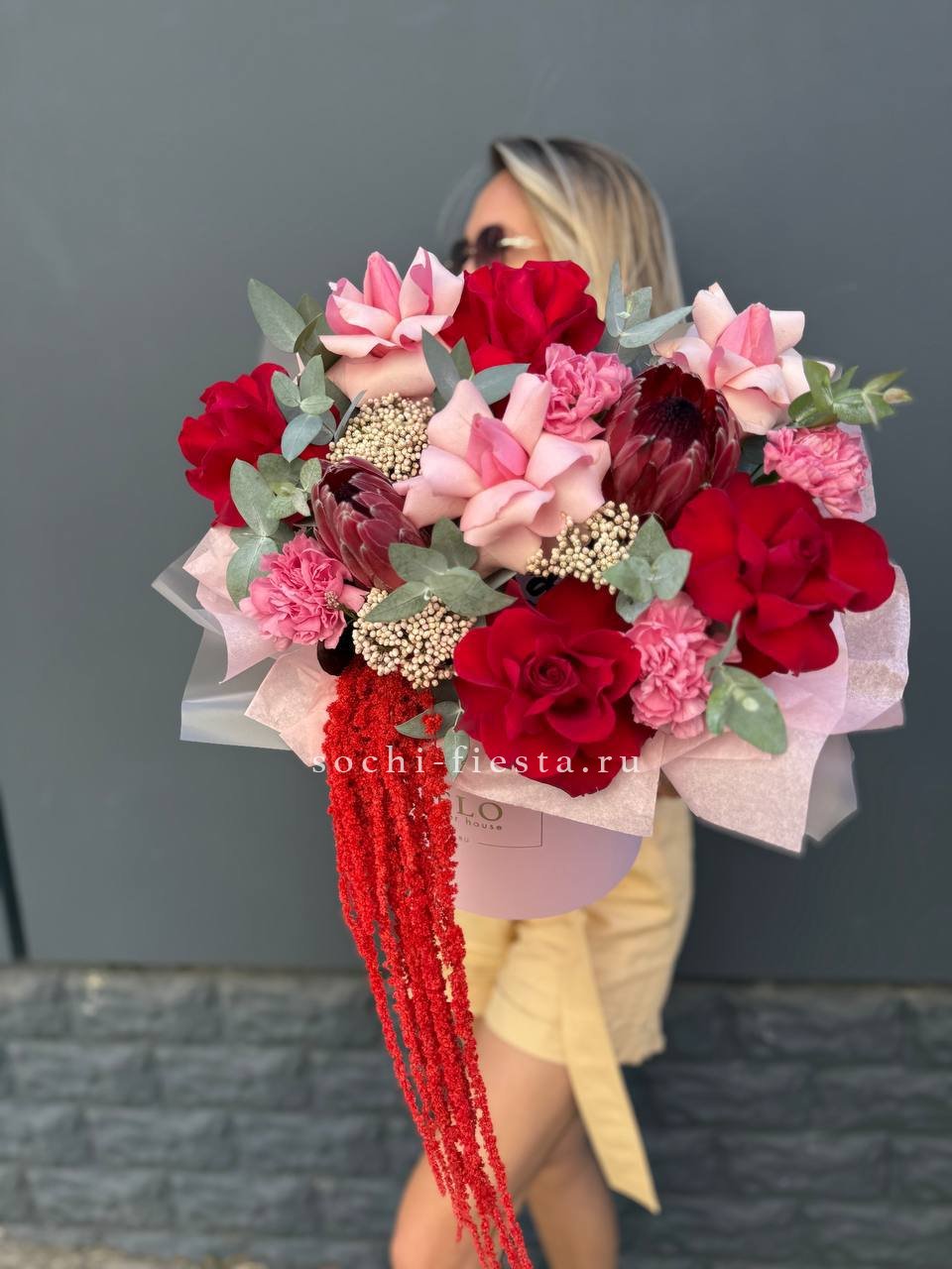 Экзотичная протея задаёт тон всей композиции, где розовые и красные розы переплетаются с фактурным озатамусом. Диантус добавляет графичности, а эвкалипт смягчает линии.