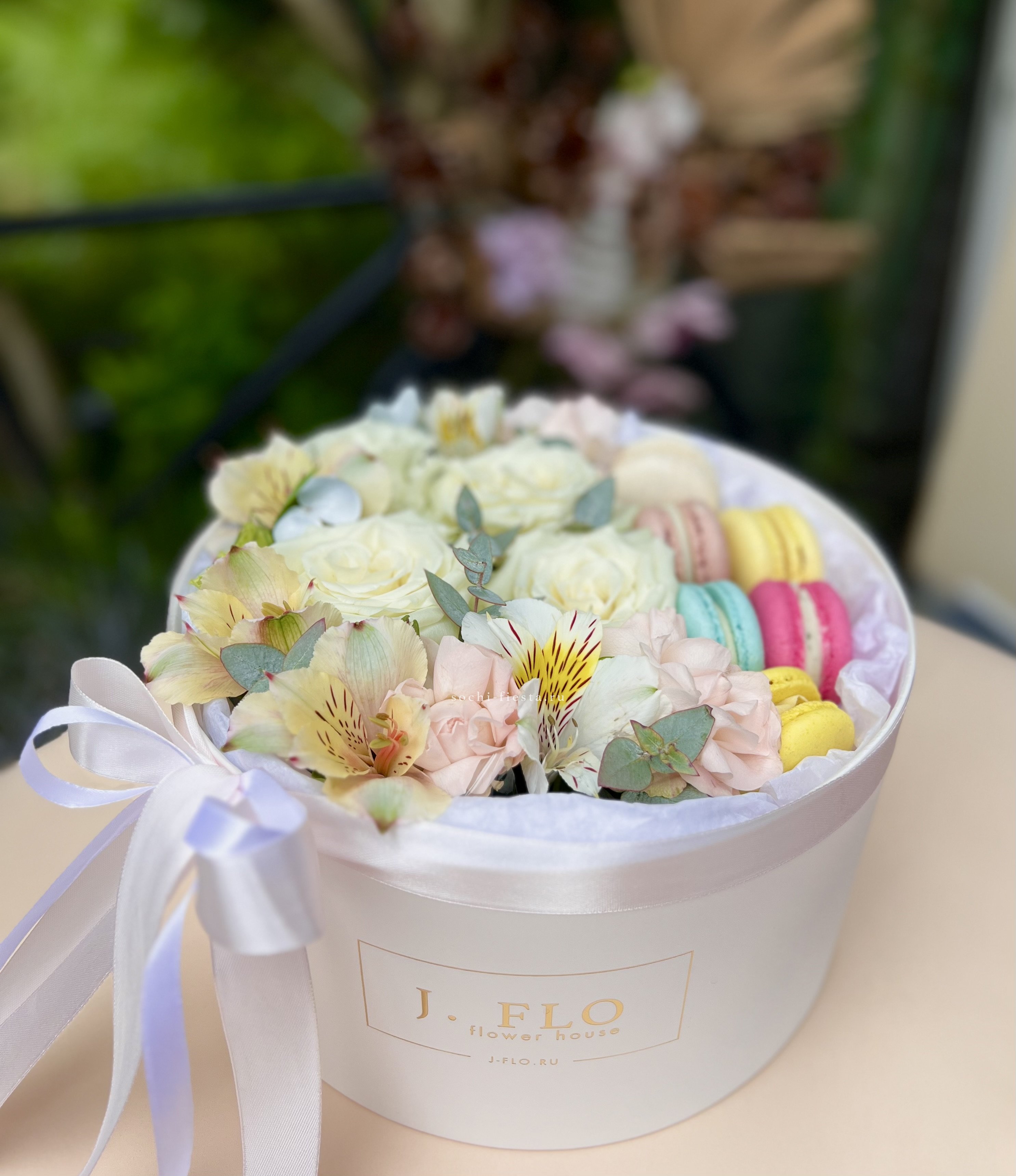 Пышная композиция в круглой коробке сочетает бутоны роз и диантусы со сладким дополнением из одиннадцати макаронс. Светлая гамма и плотное наполнение создают объемное присутствие в интерьере. Формат для тех случаев когда хочется впечатлить.