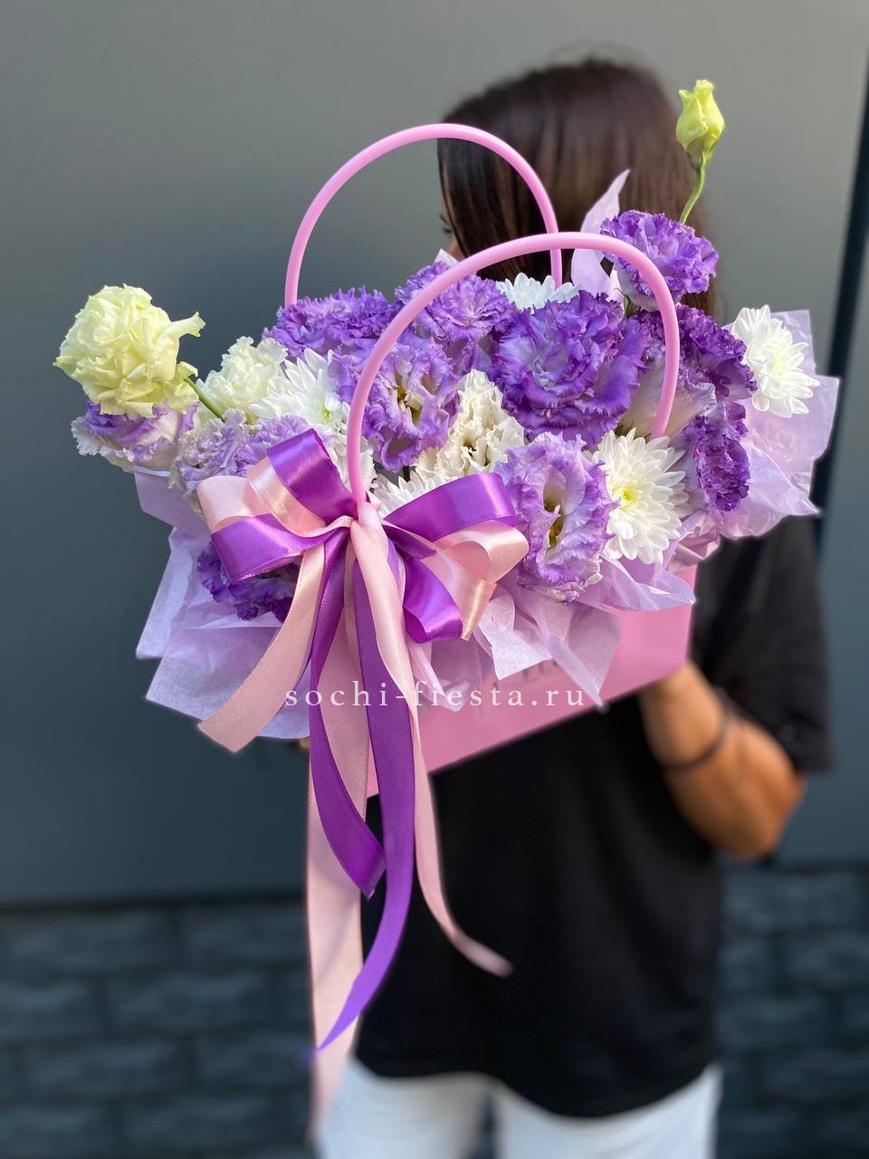 Эустома и кустовые хризантемы в сумке-кашпо образуют пышную многослойную композицию. Плотные бутоны и открытые цветки создают живую фактуру и объем.
