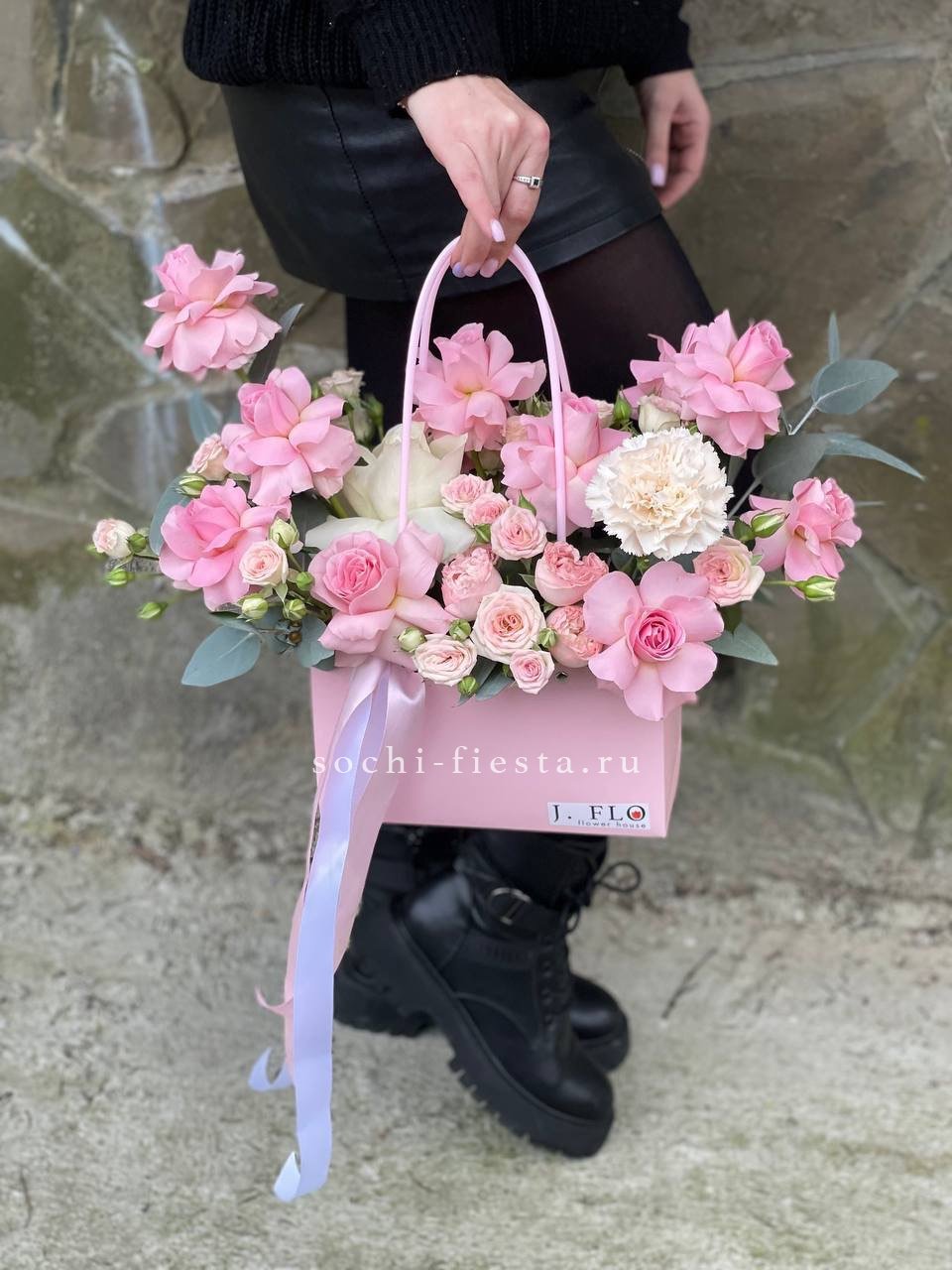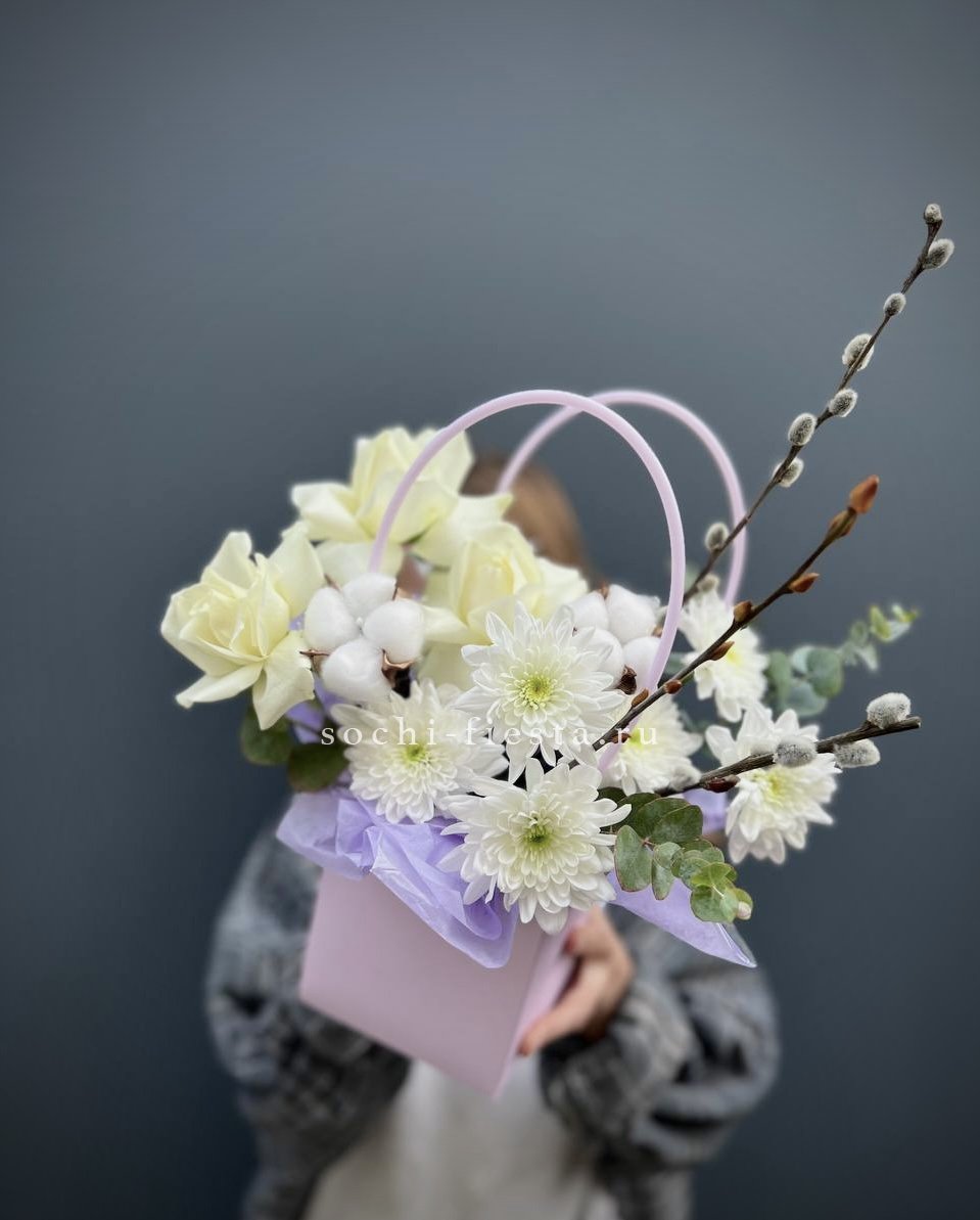 Белые и розовые розы образуют воздушную композицию с мягкими коробочками хлопка и лимониумом. Сумка-кашпо Sofi держит форму и позволяет разместить цветы на столе или полке. Букет выглядит аккуратно и остается свежим долгое время.