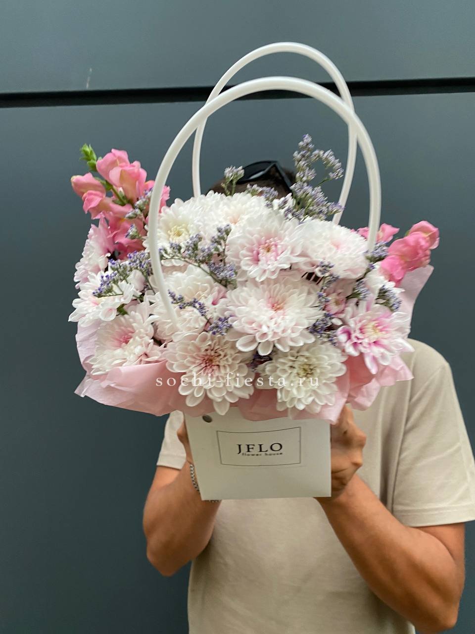 сумочка с гортензией, мисти баблс, герберой, озатамусом и эвкалиптом.