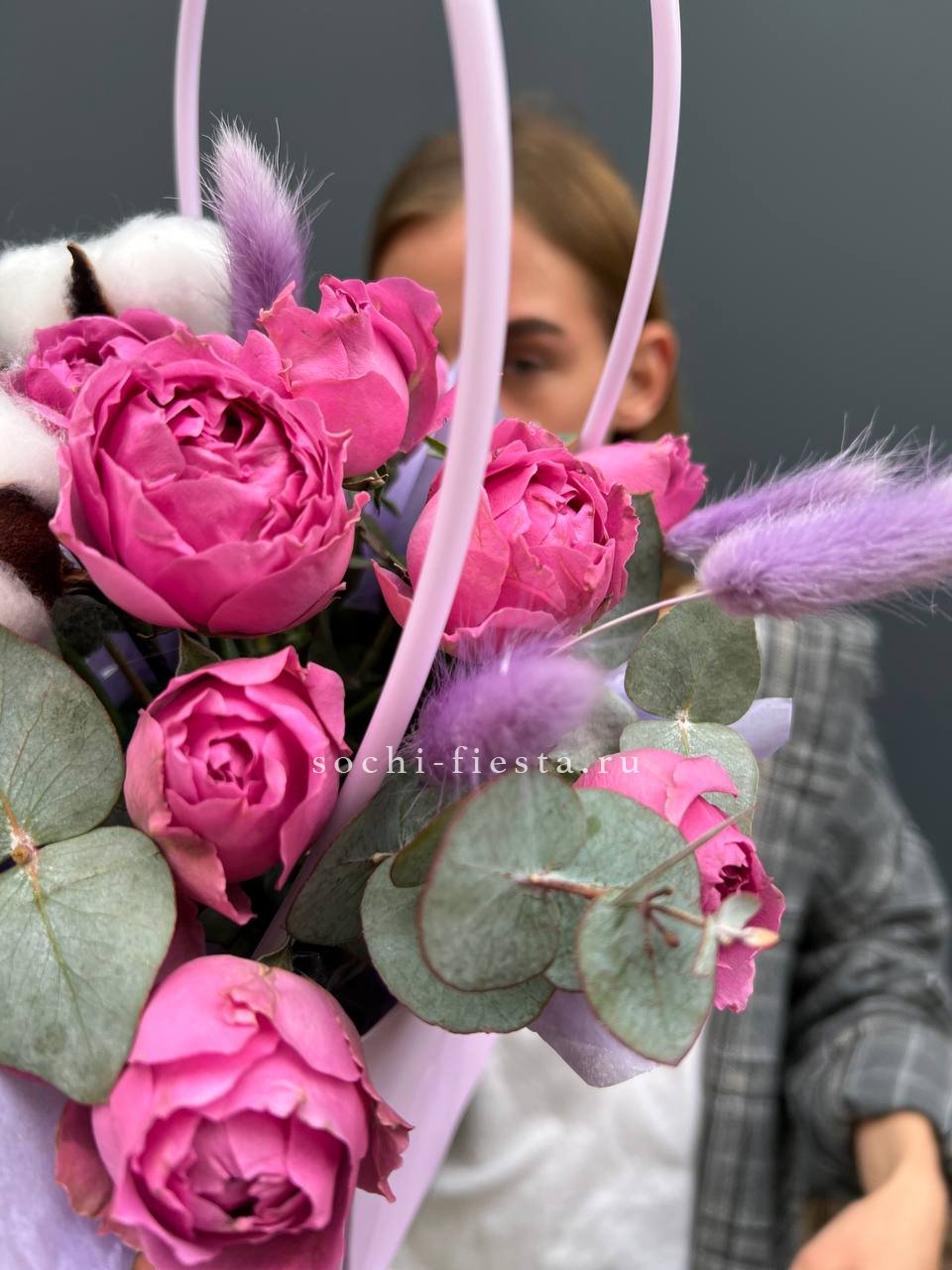 вывернутые розы- 7 шт., цилиндр D13, эвкалипт, лента, упаковка. Данная цена доступна при заказе от 10 шт.