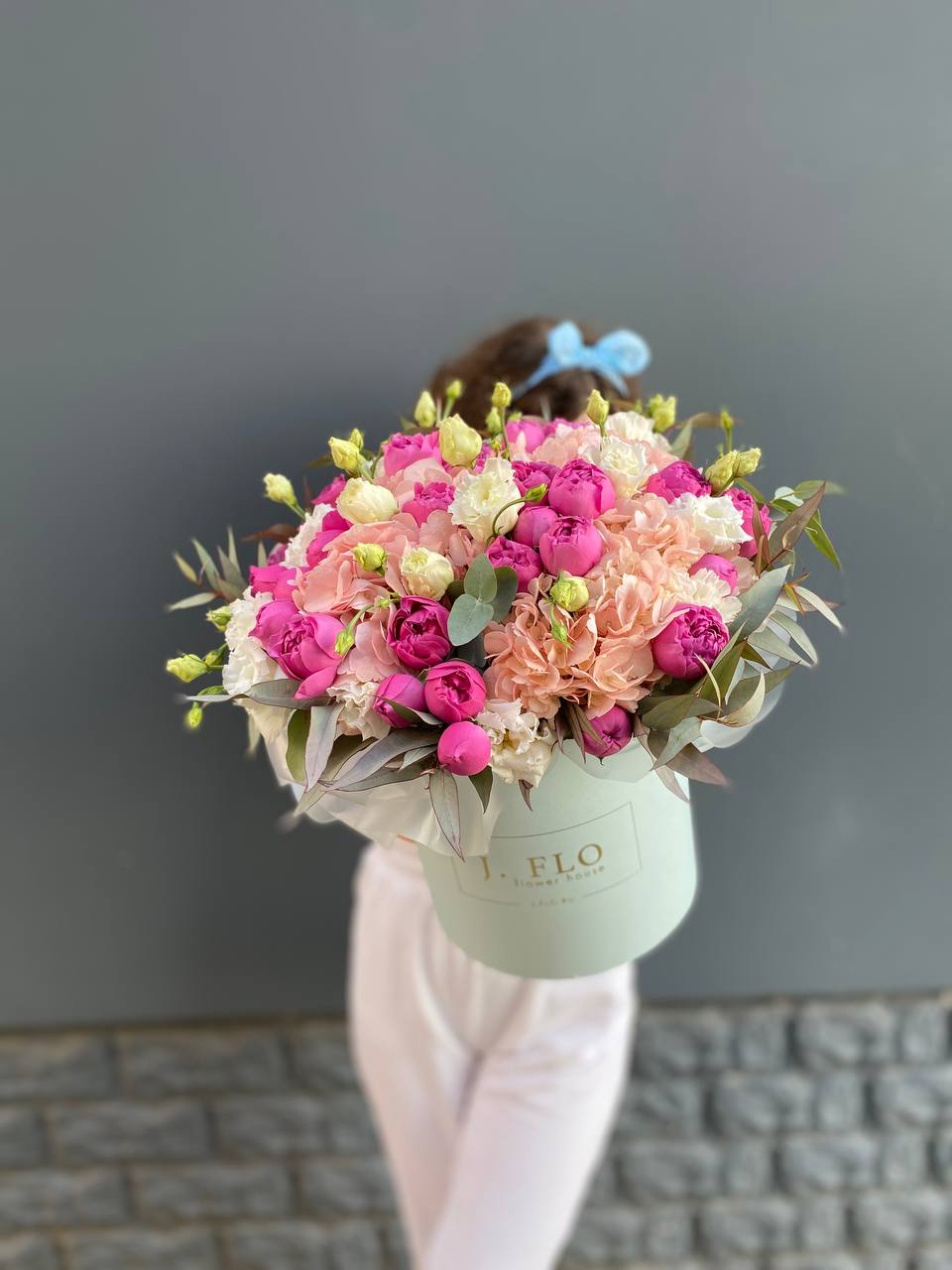 Пышная гортензия задает объем, эустома и диантус заполняют пространство между крупными бутонами. Статица добавляет графичность, а розы бомбастик завершают композицию.