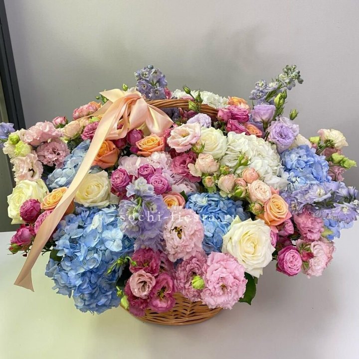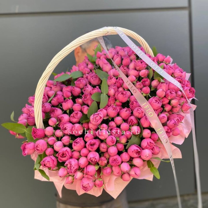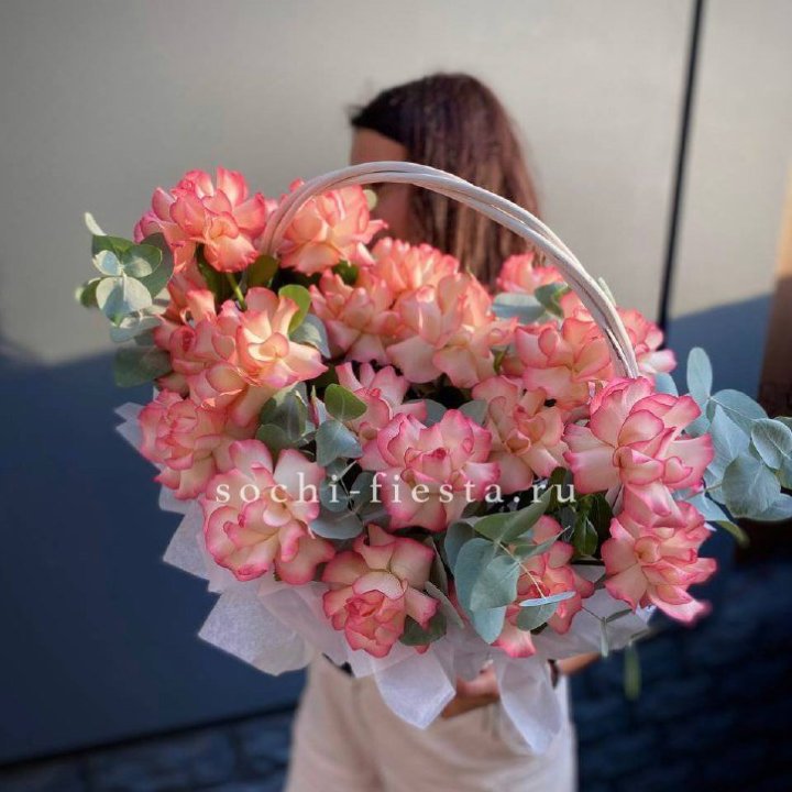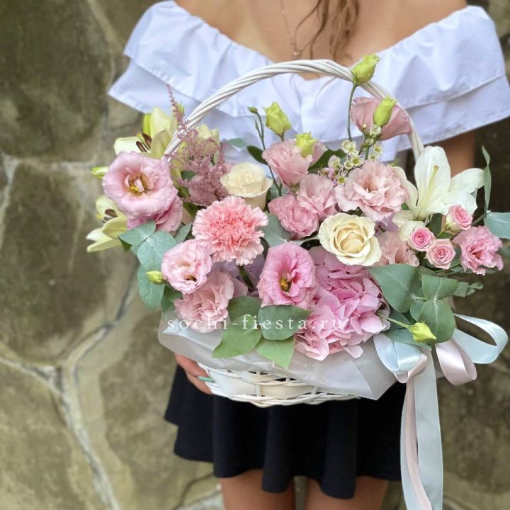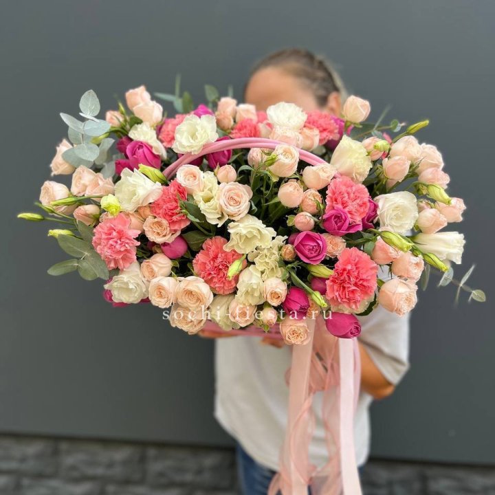 Состав корзин в Владикавказе определяется текущими поставками и сезоном. Розы Freedom, Mondial, Cappuccino — для классических куполообразных аранжировок. Пионы в мае-июне из свежих поставок: Sarah Bernhardt, Red Charm, Bowl of Cream — главный сезонный продукт. Хризантема, альстромерия, гербера — для объёмных торжественных наполнений. Эустома, ранункули — для садовых корзин. Флорист строит состав под конкретный запрос.