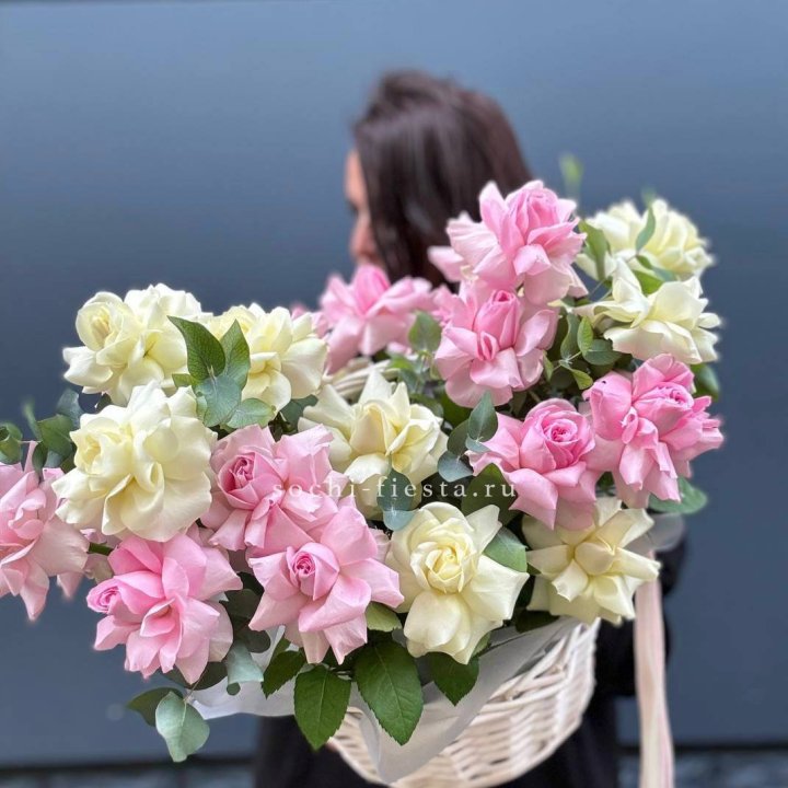 Именинная корзина в Владикавказе — самый популярный частный формат. Флорист создаёт куполообразную аранжировку в плетёной корзине диаметром 35-55 см. Розы или пионы в основе, зелень и декоративные акценты — нарядный объект, который сразу создаёт торжественную атмосферу. Именно такую корзину несут на юбилей или важный день рождения, когда хотят, чтобы подарок был виден и запомнился.