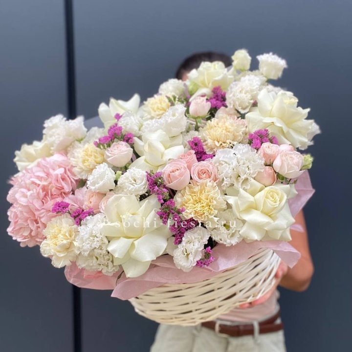 Каждый сезон приносит в Владикавказе свой ассортимент корзин. Весной флорист создаёт корзины с тюльпанами и нарциссами — лёгкие, нежные, полные ощущения обновления. В мае-июне приходят пионы — Sarah Bernhardt, Bowl of Cream, Red Charm — главный флористический праздник. Осенью — хризантема в тёплых гаммах с декоративными ягодами и ветвями. Зимой — хвойные аранжировки с амариллисом для праздничной атмосферы.