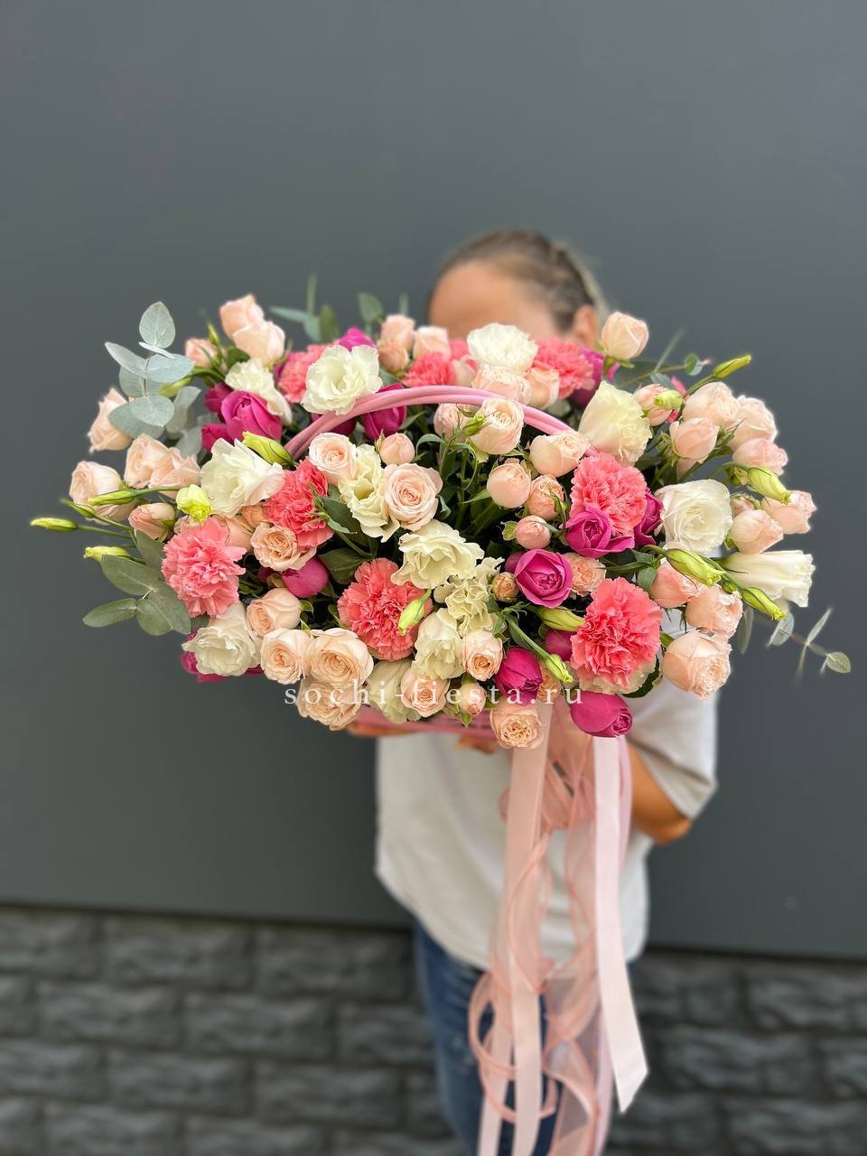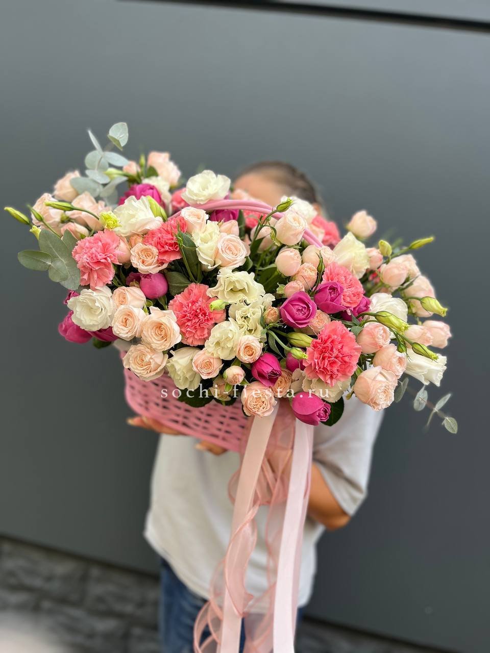 розы, эустома, гортензия, бомбастик, маттиола ( или аналог), эвкалипт, корзина.