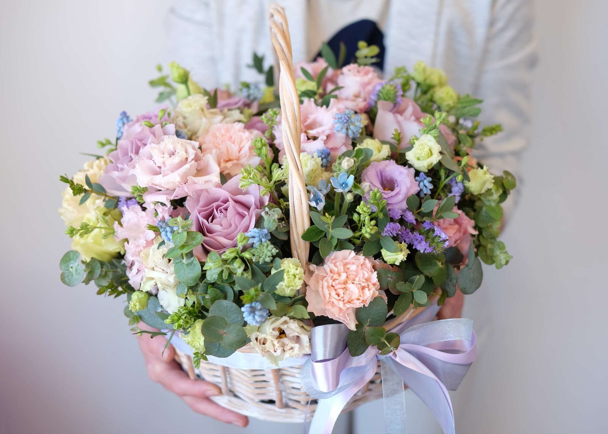 Эта роскошная интерьерная корзина — настоящее воплощение цветущего сада, наполненного нежностью и свежестью. Она выглядит невероятно объемной и фактурной благодаря гармоничному сочетанию классических и экзотических цветов.
