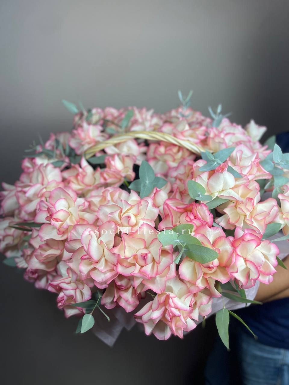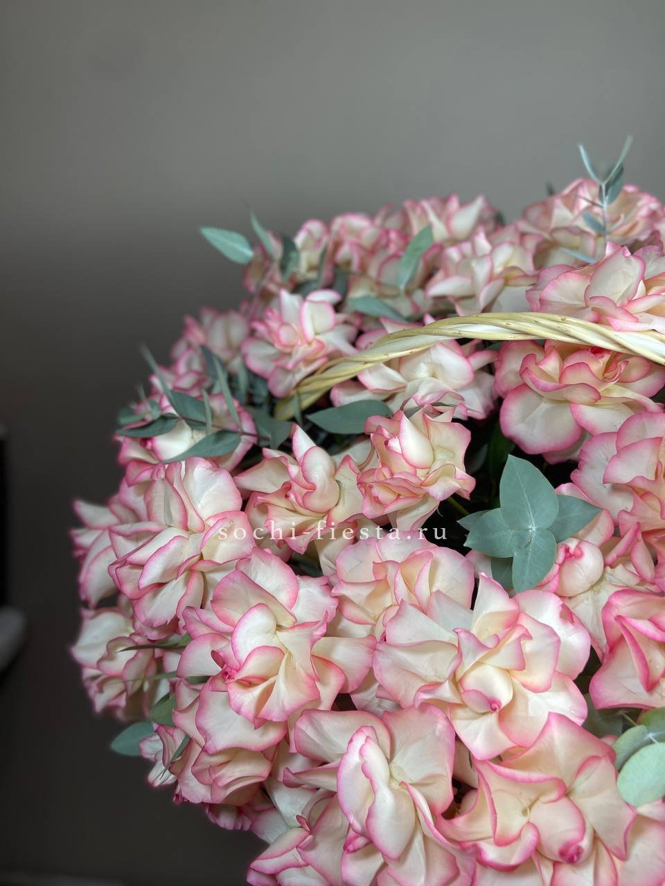 цветочная корзина с розами, мисти баблс, диантусами и гортензией.
