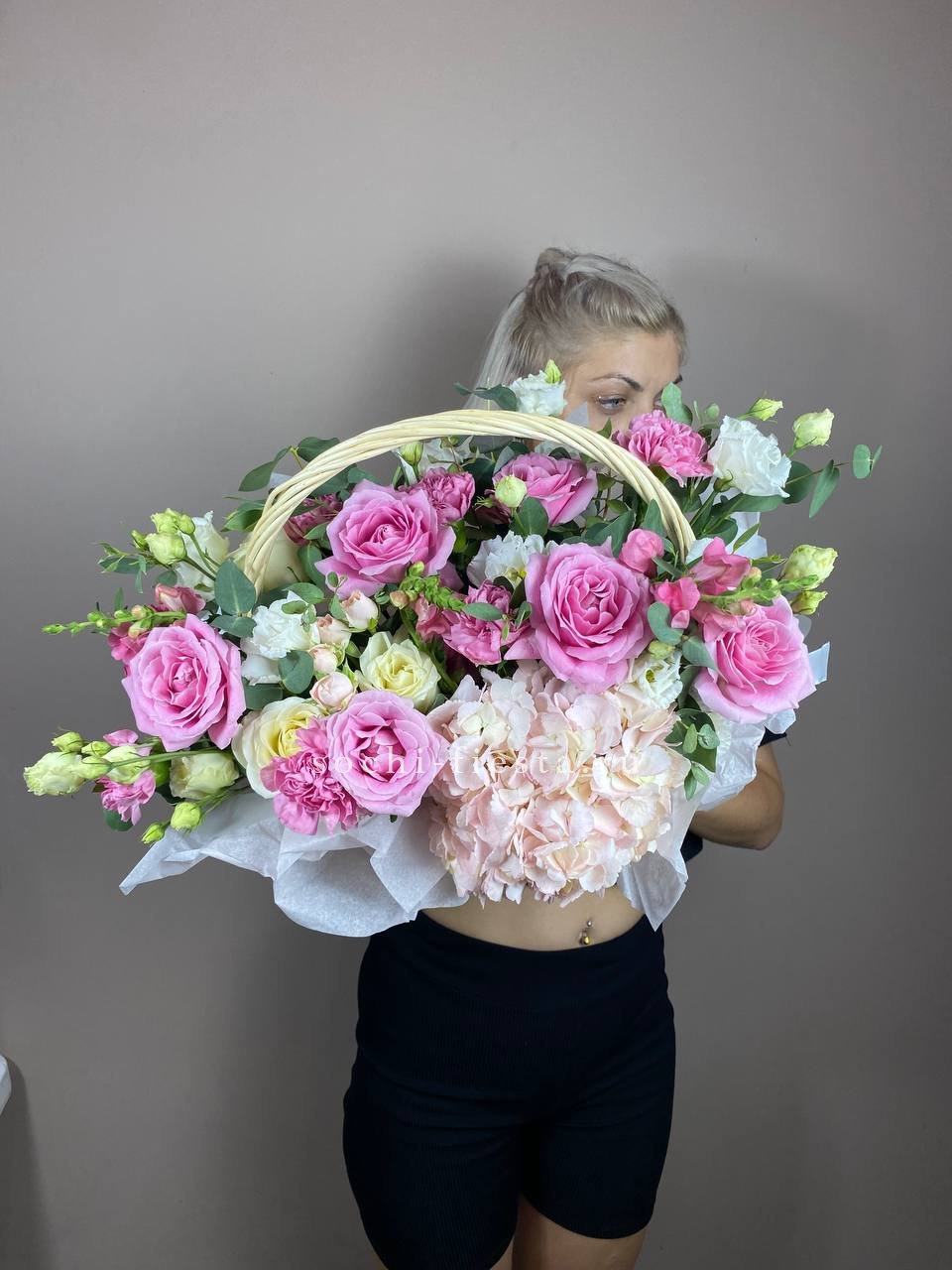 Пышная корзина с розами и гортензией раскрывается мягкими переходами розовых тонов. Эустома и диантус добавляют воздушности, а эвкалипт создает свежую основу для многослойной композиции. Авторская работа для важных событий и значимых встреч.