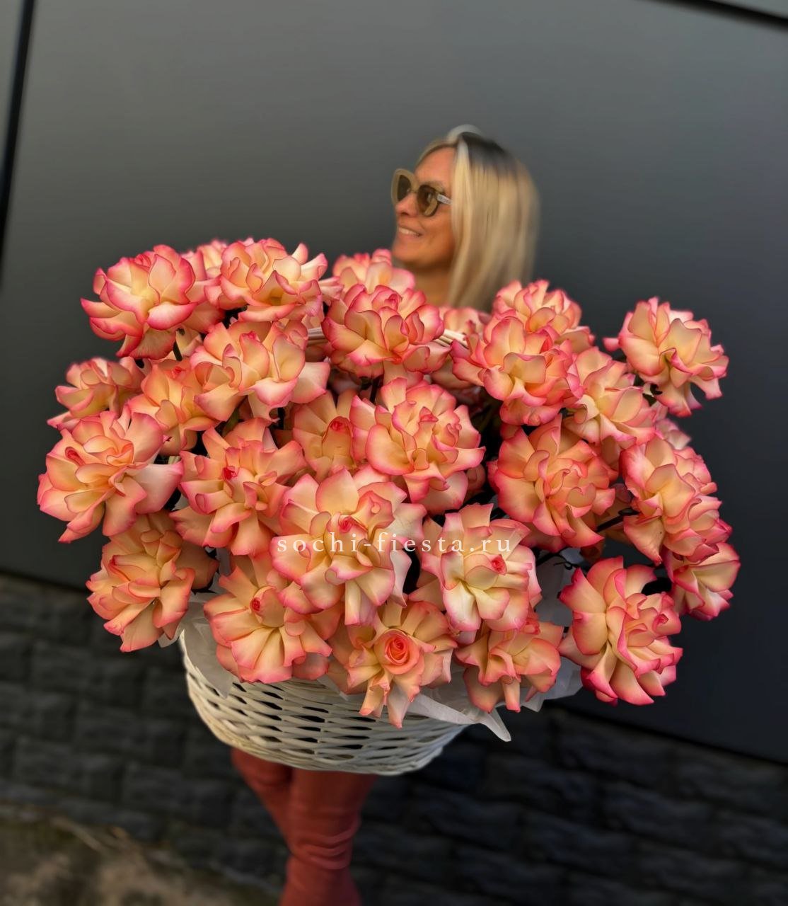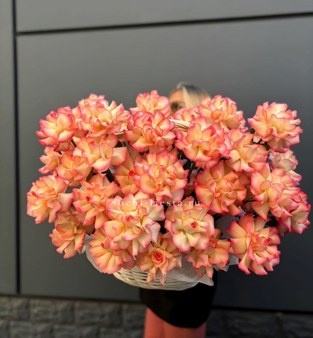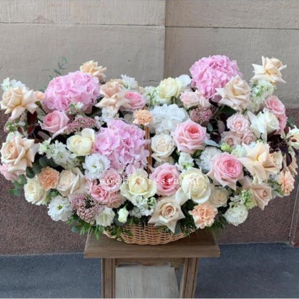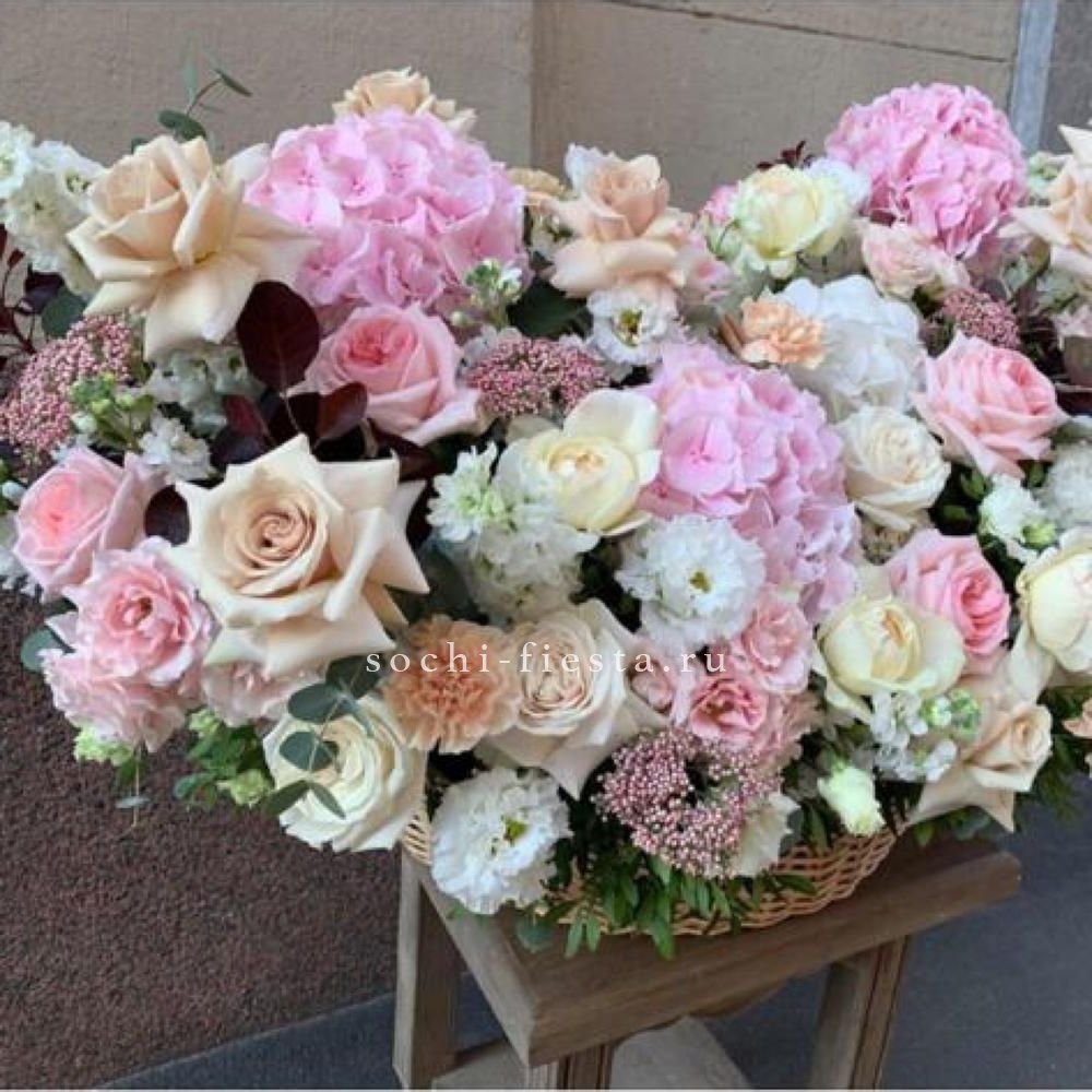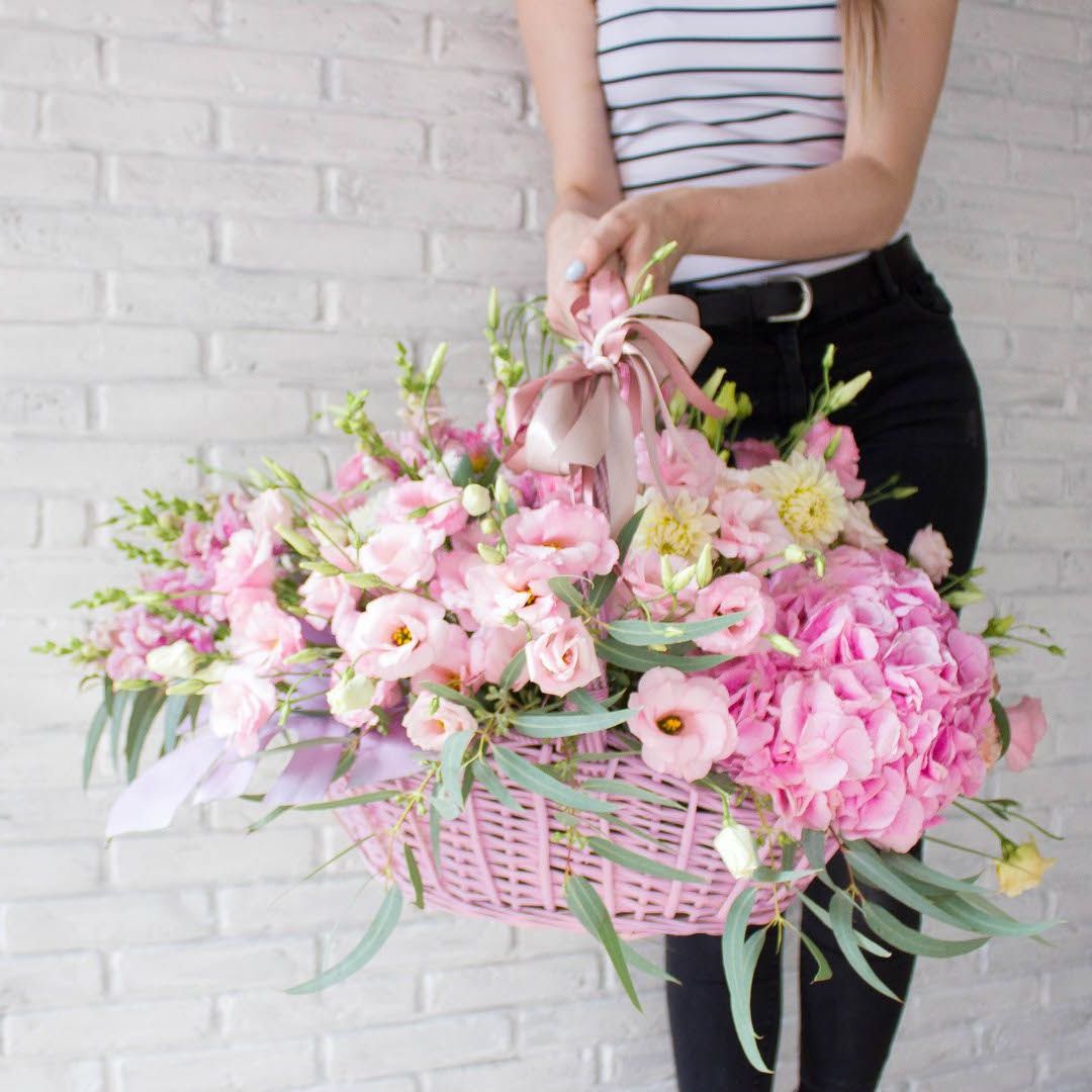 Корзина собрана плотно, каждый цветок находит своё место в общей композиции.