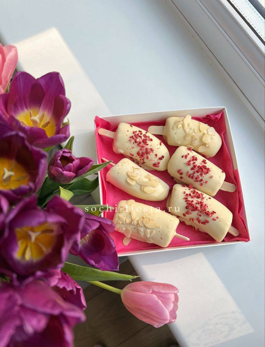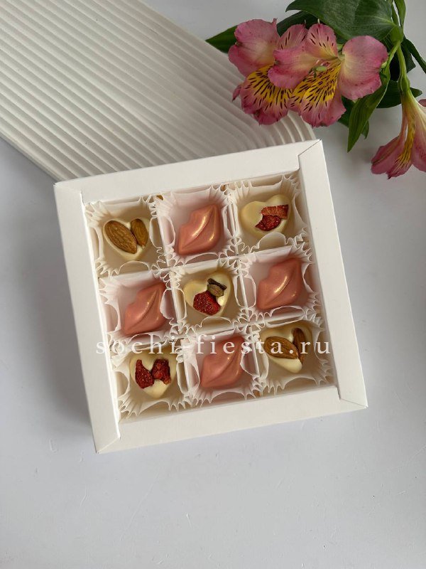 Бельгийский шоколад раскрывается белоснежной глазурью с яркими вкраплениями клубники и орехов. Каждая конфета собрана вручную из натуральных ингредиентов. Миндаль и фисташка добавляют композиции текстурную глубину.