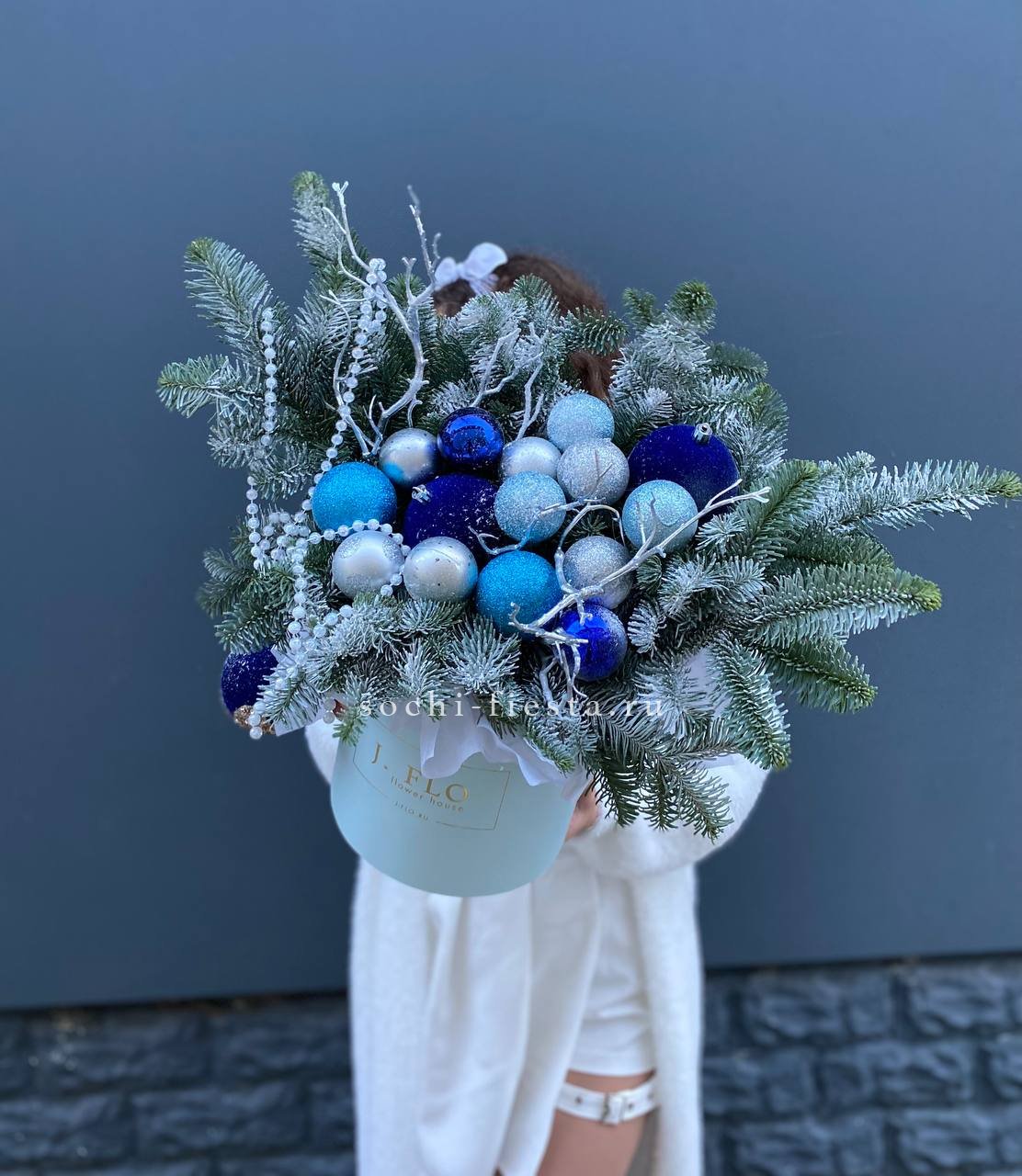 Холодные оттенки игрушек и декора переплетаются с насыщенной зеленью нобилиса. Композиция построена на игре глубоких и светлых тонов без лишней пестроты. Цилиндр задает четкую геометрию всей конструкции.