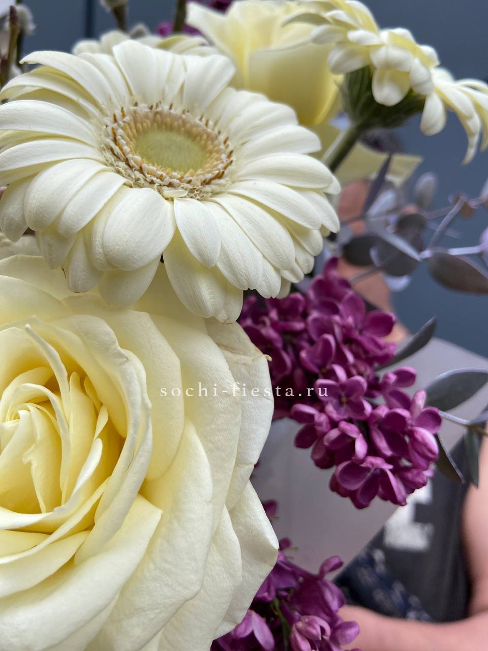 Белые розы и герберы собраны в круглую форму вместе с пушистыми веточками вербы и душистой сиренью. Композиция в коробке держит объём и выглядит цельно. Весенний букет для светлых дней и семейных встреч.