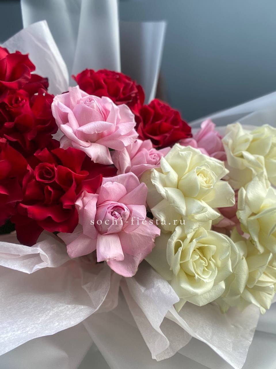 роза - 15 шт.,  фисташка или эвкалипт, лента, дизайнерская упаковка.