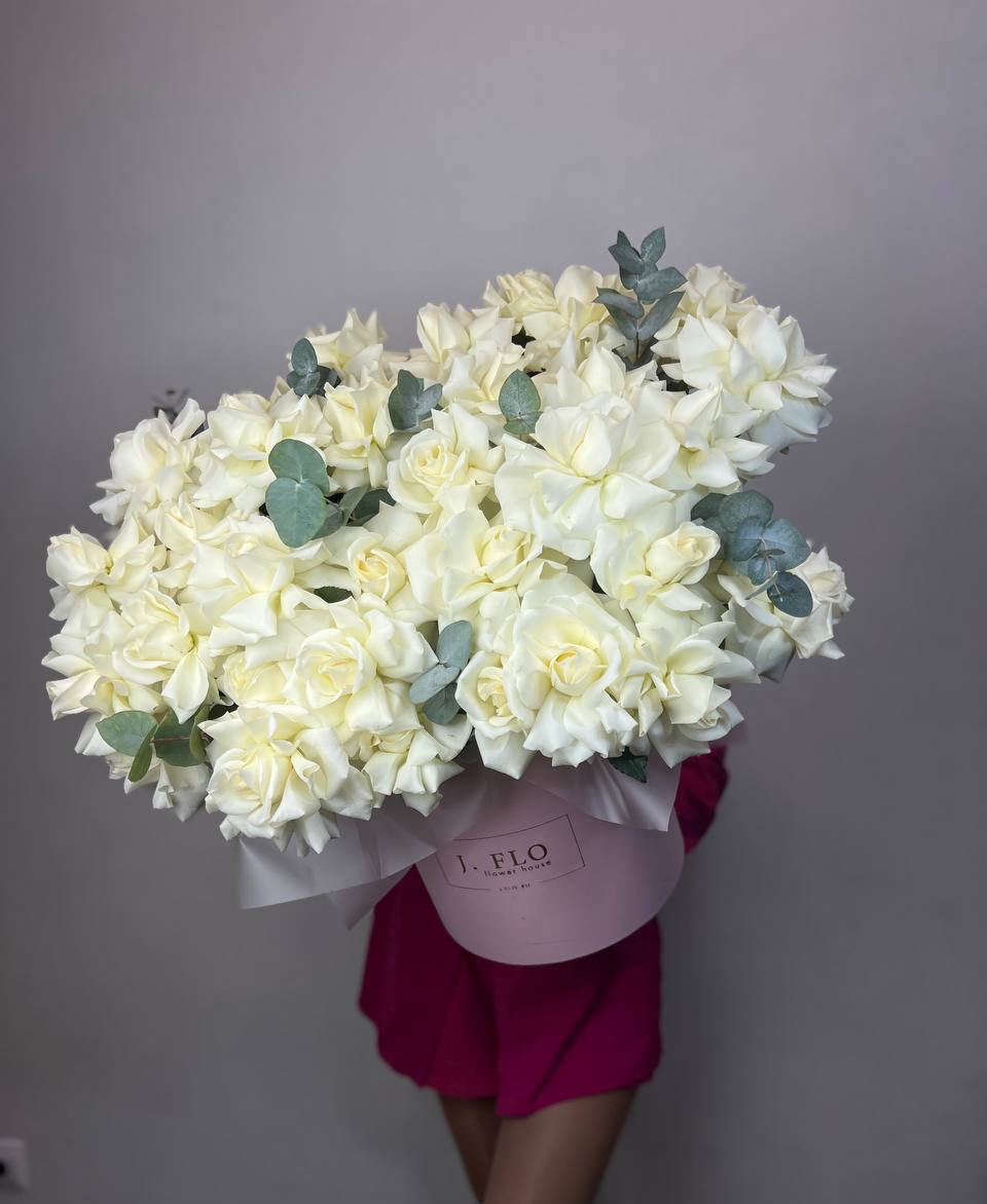 Тридцать семь белых французских роз собраны в круглый бокс с ветками эвкалипта. Плотная укладка бутонов создает объемную композицию, где каждый цветок виден и держит форму. Безупречное решение для яркого события.