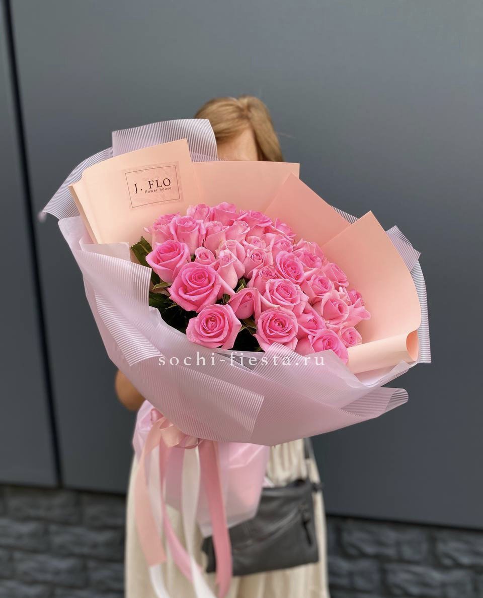 Пятьдесят один бутон формирует роскошную композицию насыщенного розового цвета. Авторское оформление придает букету завершенность. Такой масштаб производит яркое впечатление с первого взгляда.