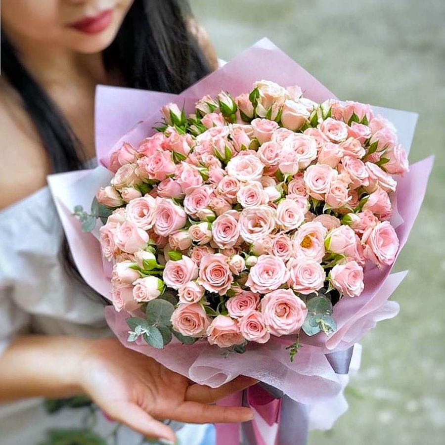 Сто один стебель кустовой розы собраны в плотный букет с множеством мелких бутонов. Каждая ветвь раскрывается пышной шапкой соцветий, создавая объёмную текстуру и живую динамику композиции.