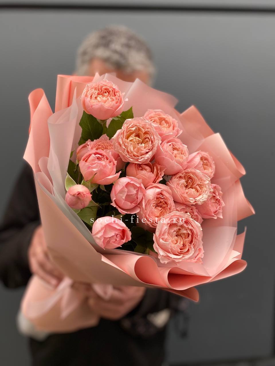 Пять веток кустовой розы Джульетта в лаконичной сборке. Каждая ветвь раскрывается несколькими бутонами теплого персикового оттенка. Компактный формат для быстрого знака внимания.