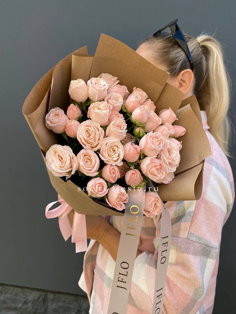 11 пионовидных кустовых роз Bombastic (или Porcelain Lace), дизайнерское оформление, лента.