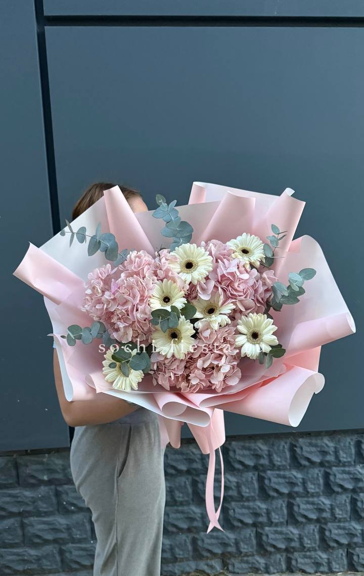 маттиола, розы, гортензия, диантусы, хризантемы , лента и дизайнерская пленка.