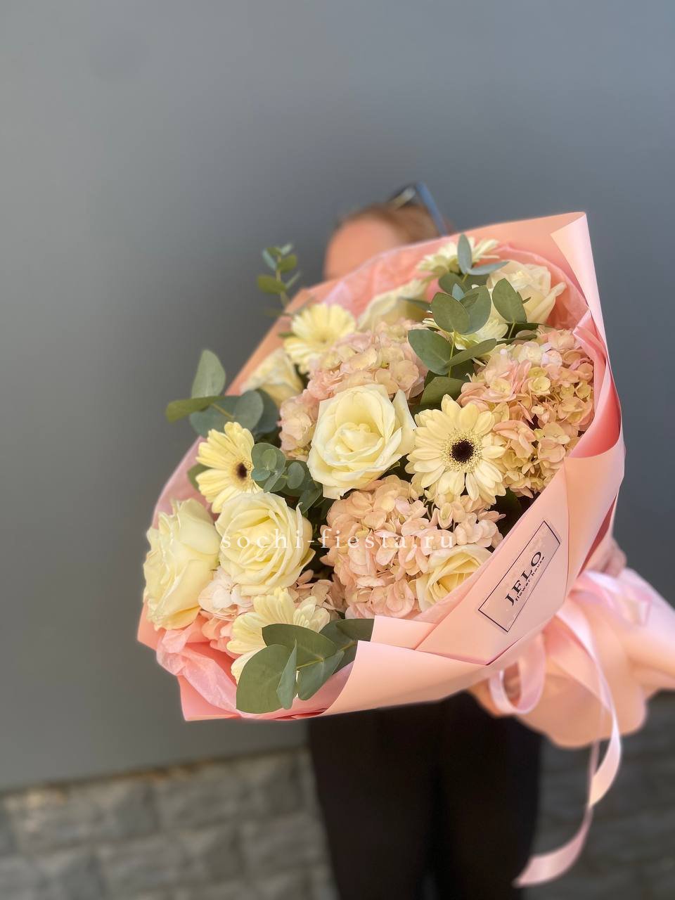 Герберы задают открытый характер букета, розы добавляют мягкости, а гортензия наполняет объёмом. Композиция смотрится свежо и держит форму без усилий.