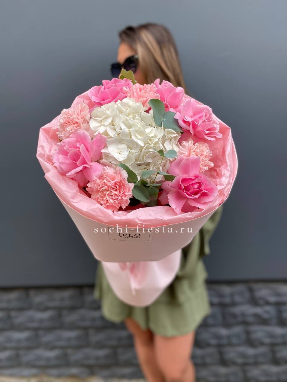 гортензия, кустовые розы, ковыль, диантус, эвкалипт, авторское оформление.