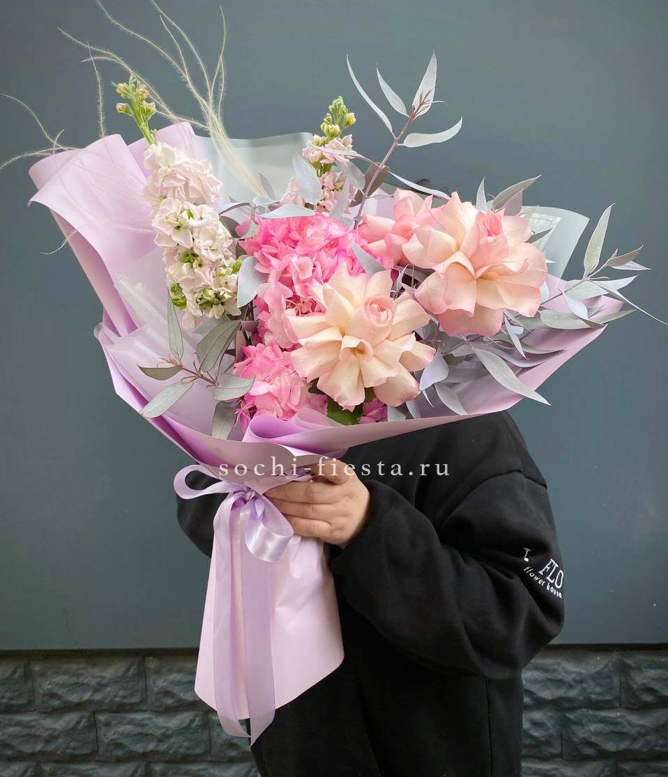 французские розы, маттиола, гортензии, эвкалипт, стифа, упаковка, лента.