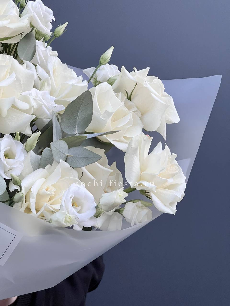 Вывернутые лепестки роз открывают объёмную сердцевину, эустома добавляет воздушности. Букет выглядит свежо и современно, эвкалипт завершает композицию матовой зеленью.
