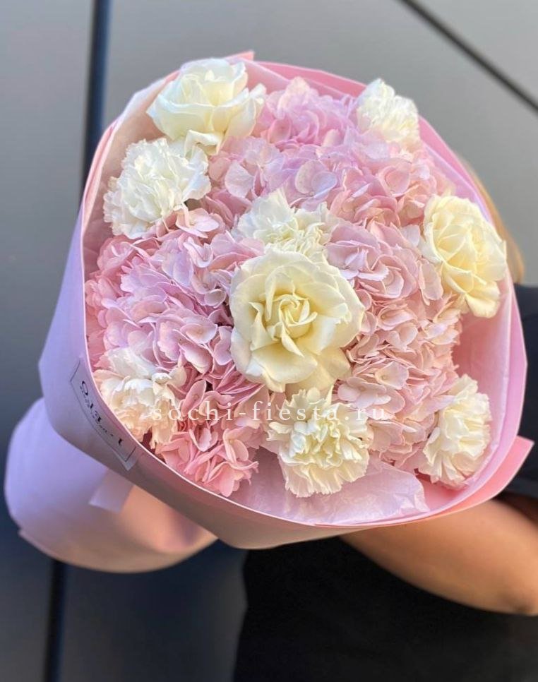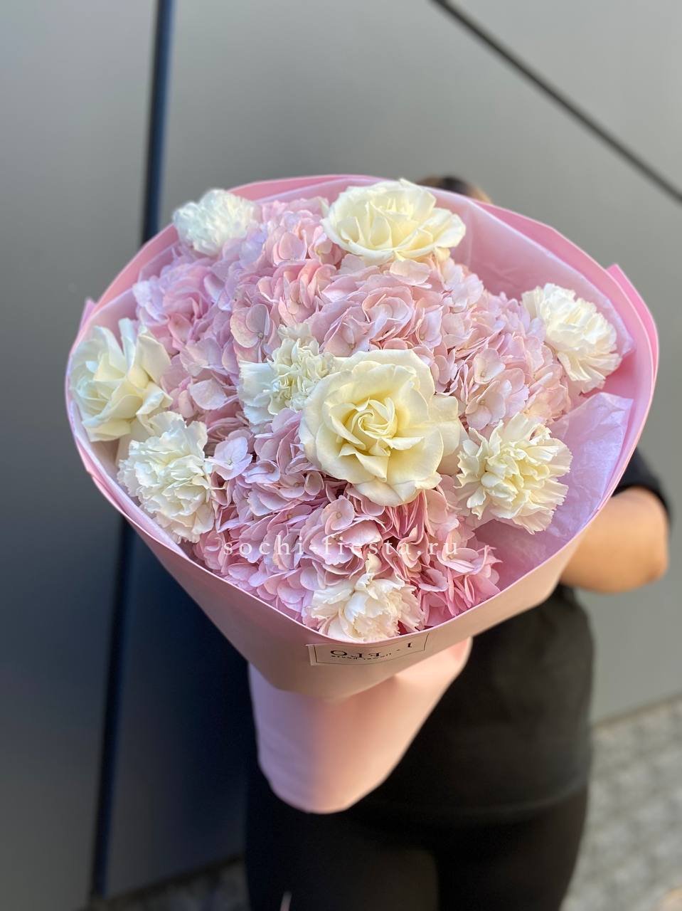 Французские розы и кустовые хризантемы собраны в букет с плотной текстурой и мягким переходом оттенков. Композиция держит форму и долго сохраняет свежесть.