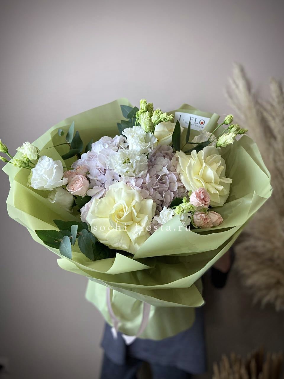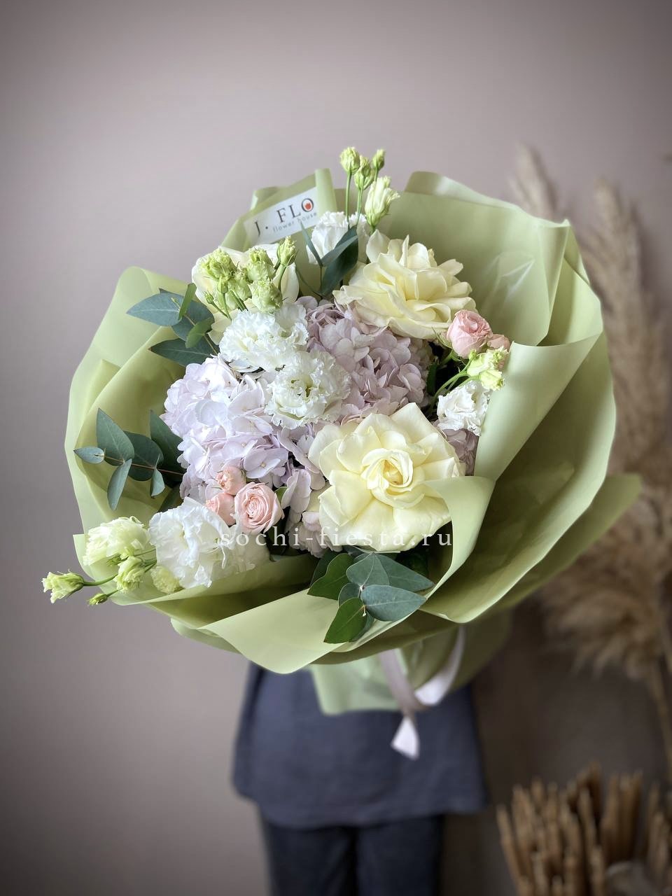 диантус, розы, бомбастик, эвкалипт, упаковка.