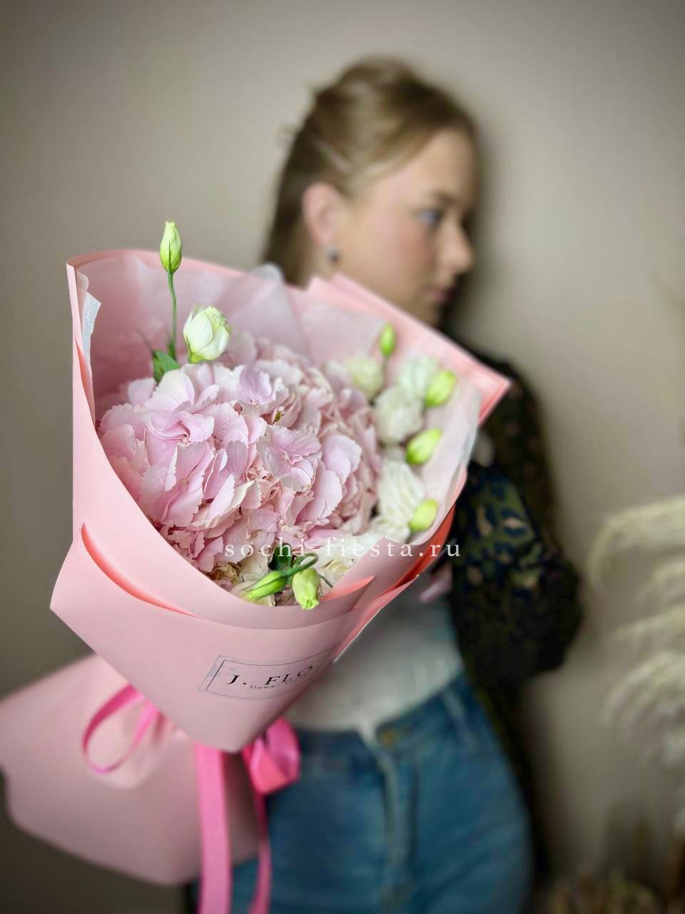 пионовидные розы, розовые пионы, диантусы, эвкалипт, лента, дизайнерская упаковка.
