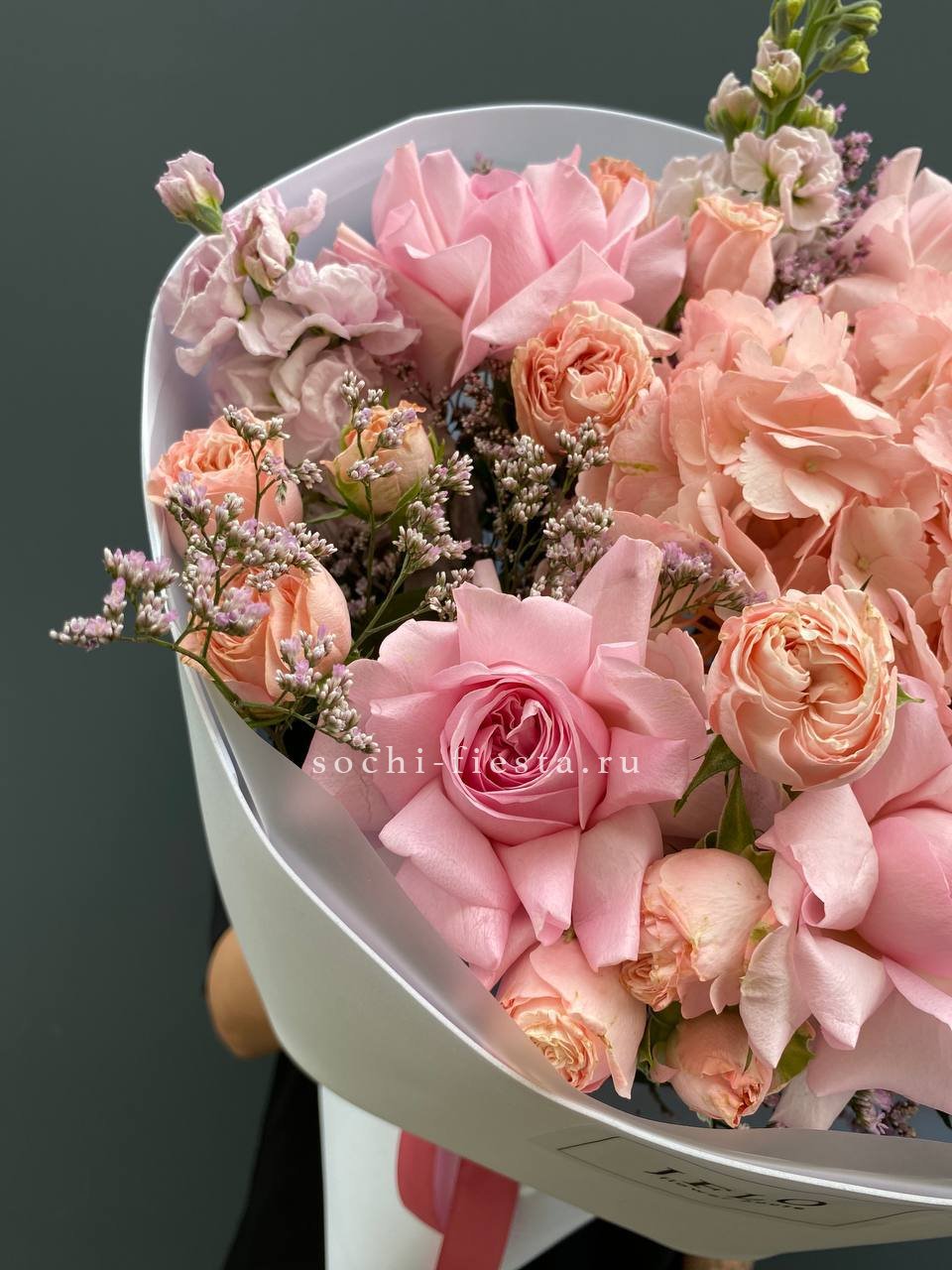 гортензия, розовые розы, кустовые розы, маттиолы,, лимониум лента и дизайнерская пленка.