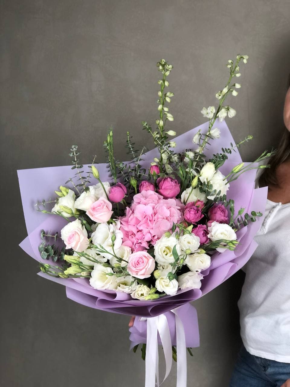 Белые розы и эустома образуют мягкую светлую основу, которая успокаивает взгляд. Диантус и хризантема наполняют букет объёмом, а эвкалипт вносит природную свежесть.