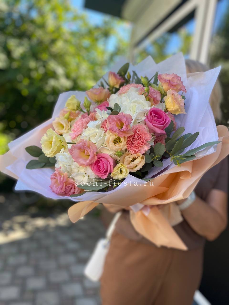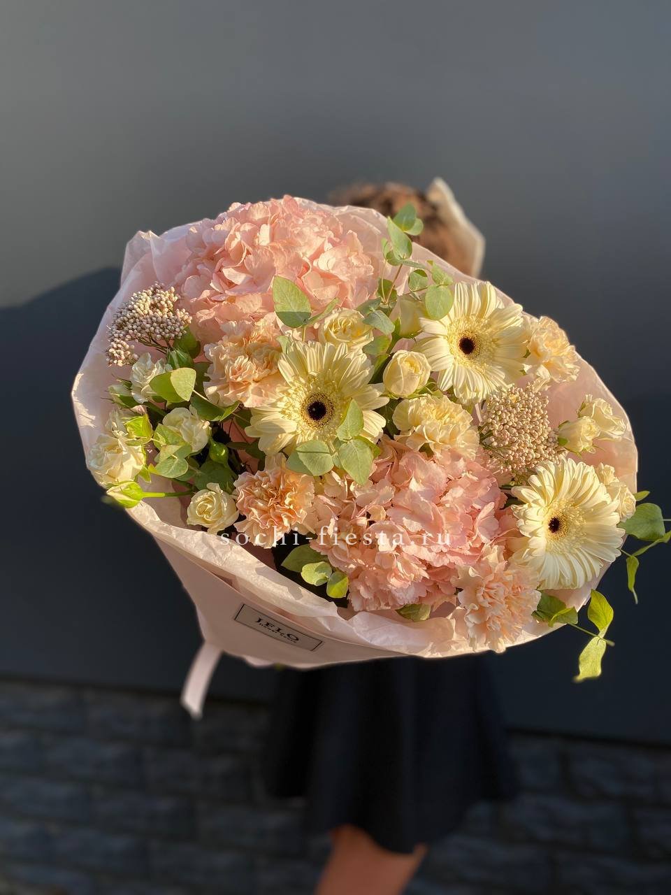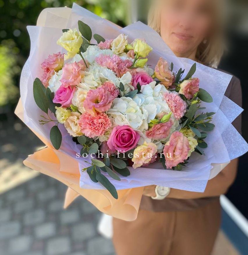 Масштабная композиция с пионами, эустомой и розами разворачивается во всей красе. Хризантемы и гортензия создают впечатляющее присутствие, которое преображает пространство вокруг.