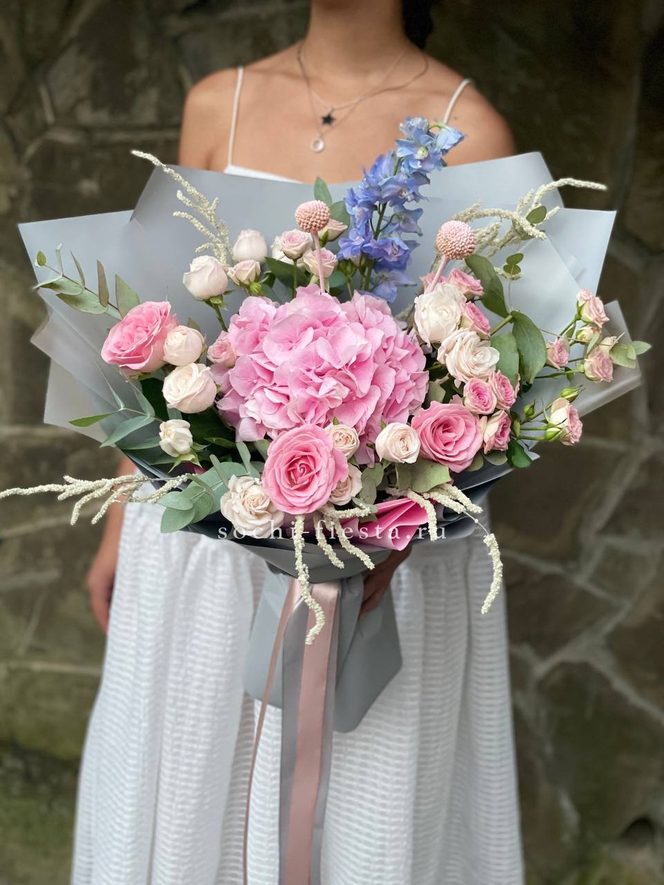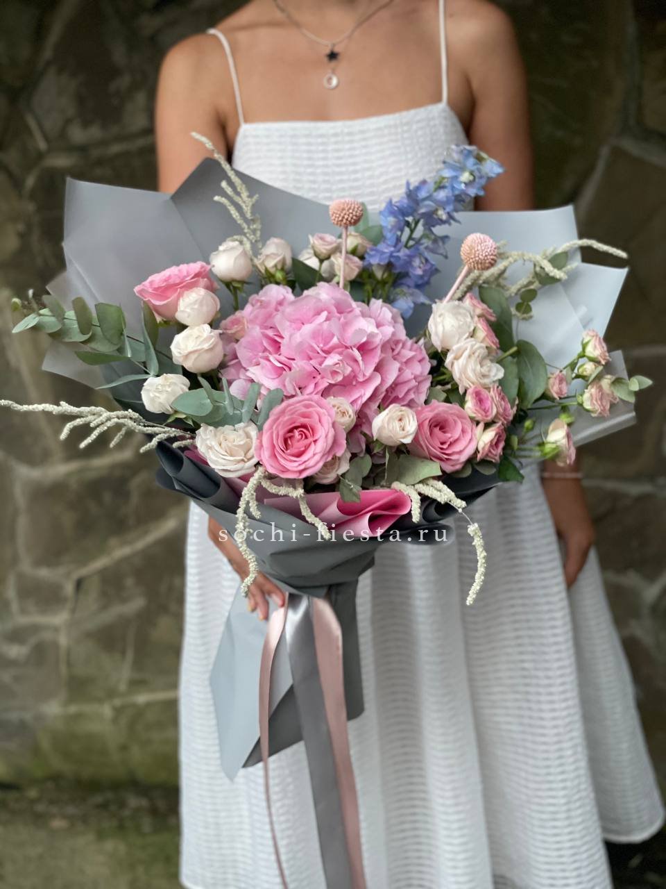 хризантема, гортензия, розовая роза, эустома, пионы ( может меняться, в зависимости от сезона), бомбастик, диантус, лента.