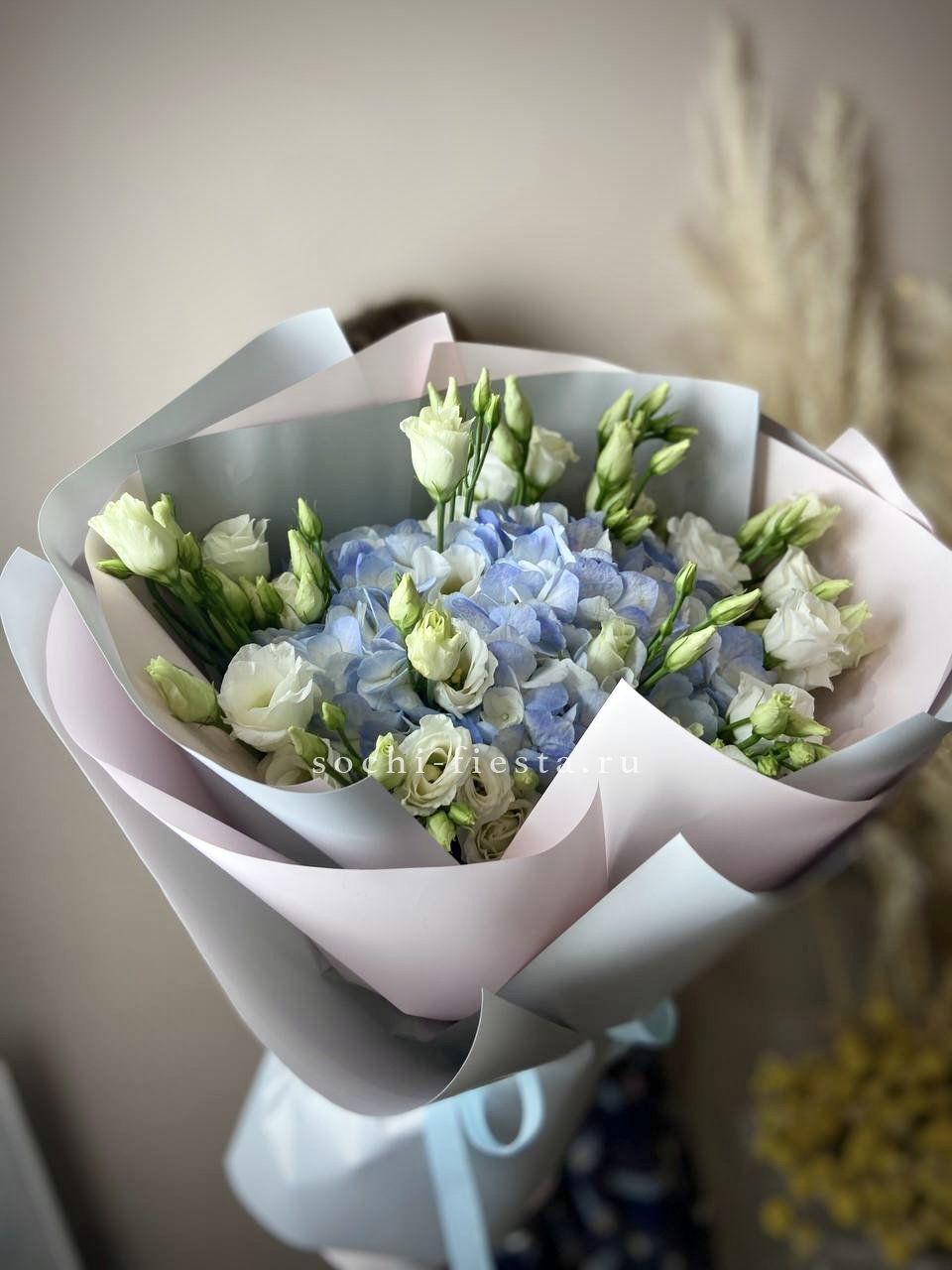 гортензия, пионовидные розы, эвкалипт, пампасная трава, лента, дизайнерская упаковка.