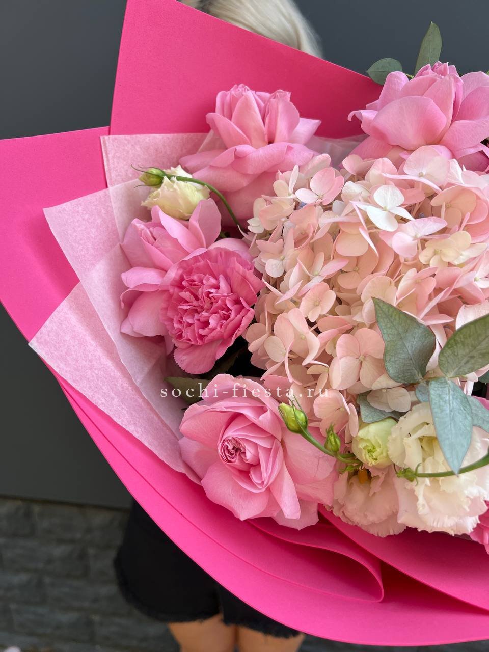 Воздушная гипсофила и струящийся амарантус создают движение вокруг крупных соцветий гортензии и роз Джумилия. Композиция построена на игре объемов и лёгкости линий.