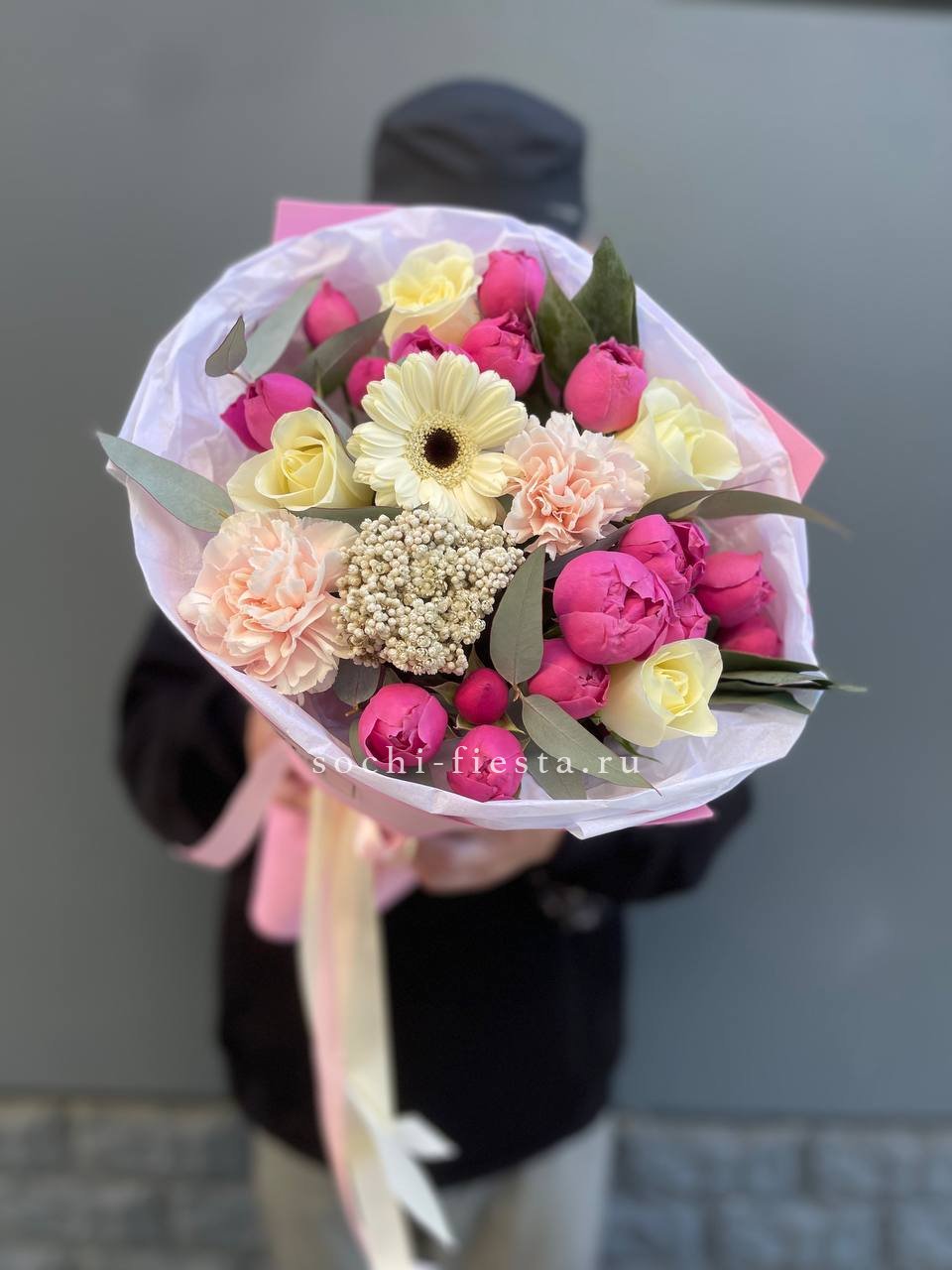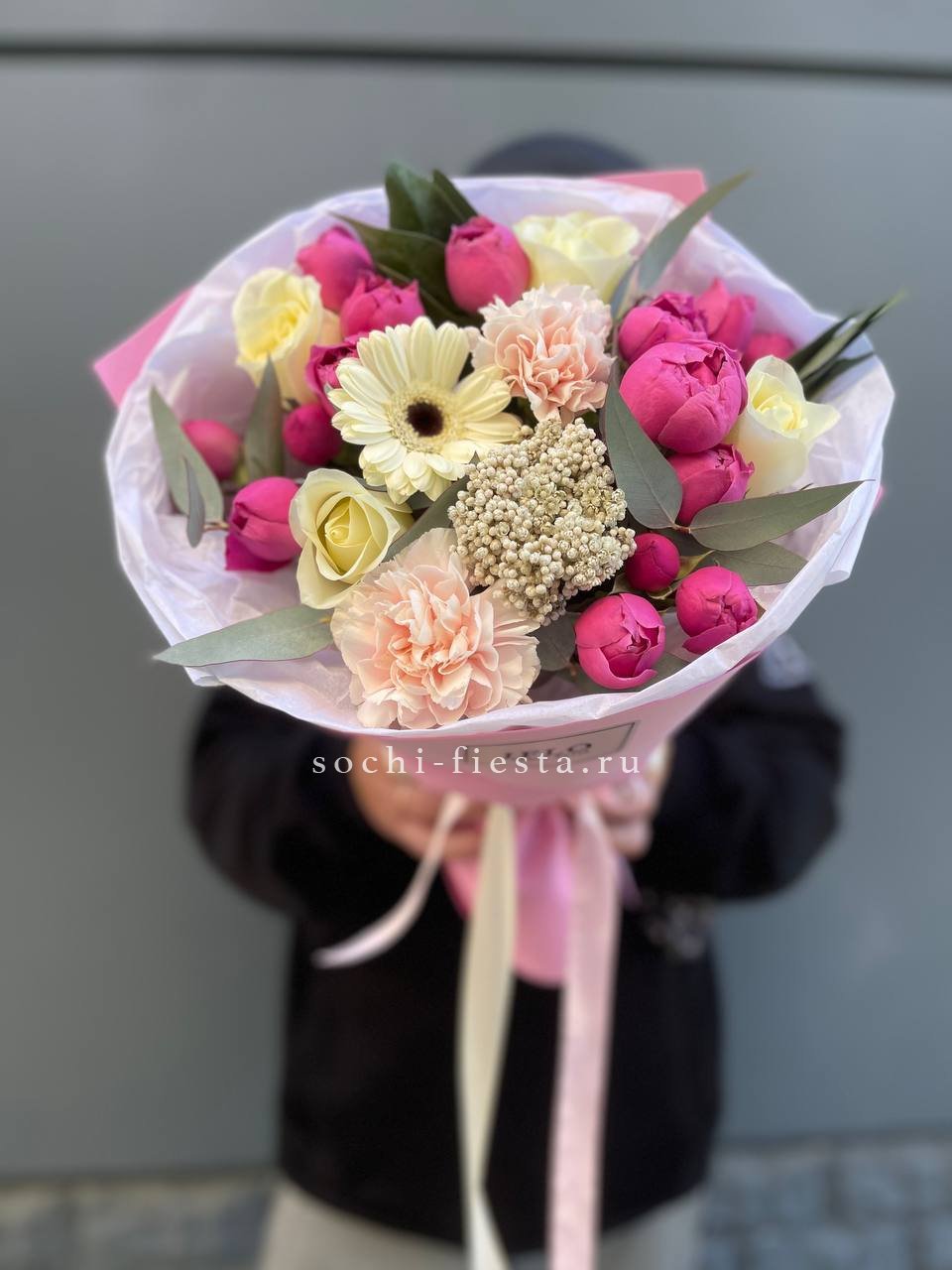 хризантемы, диантусы, розы, эустома, гортензия, лента, корейская пленка.