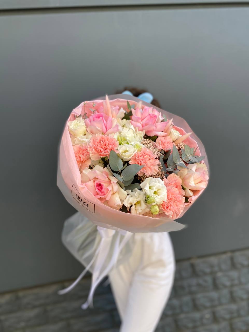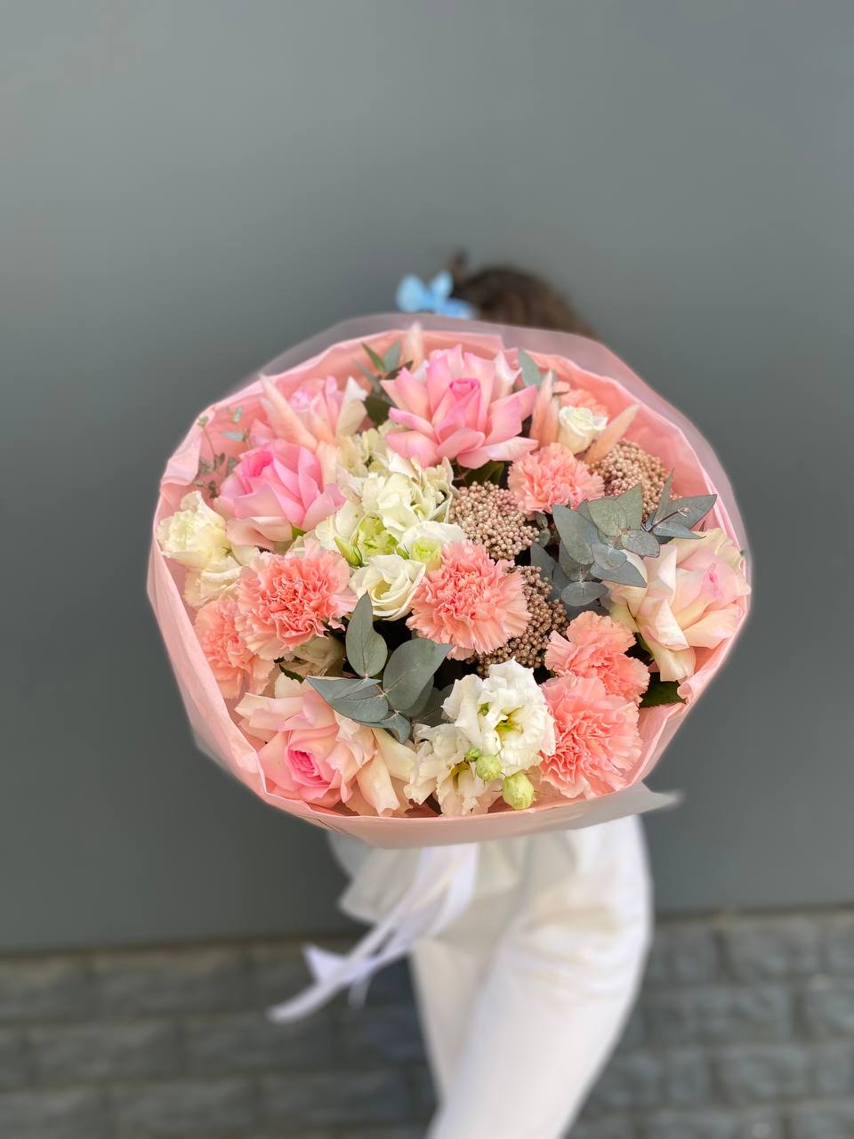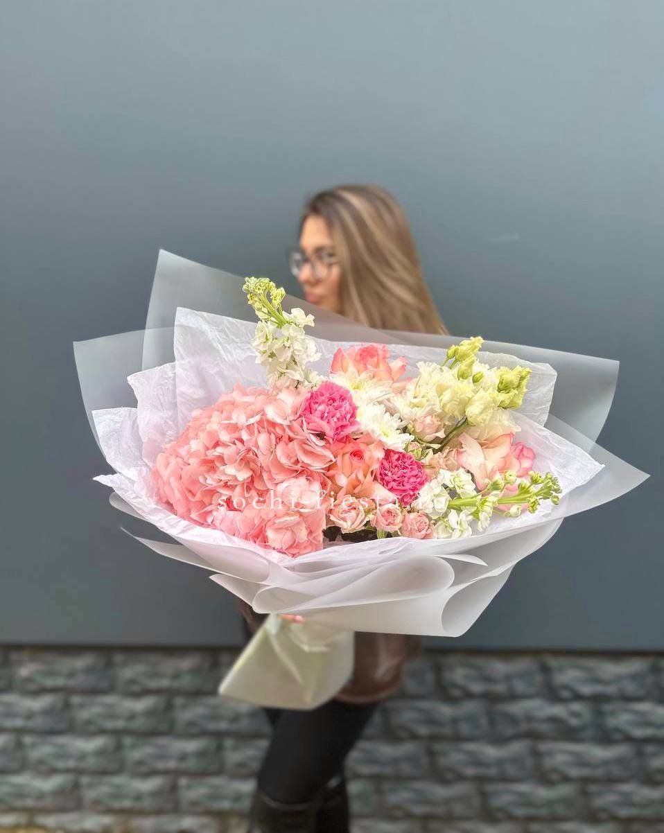 Букет объединяет хризантемы, диантусы, розы, эустому и гортензию в плотную композицию. Корейская пленка удерживает форму и создает графичный силуэт с четкими границами.