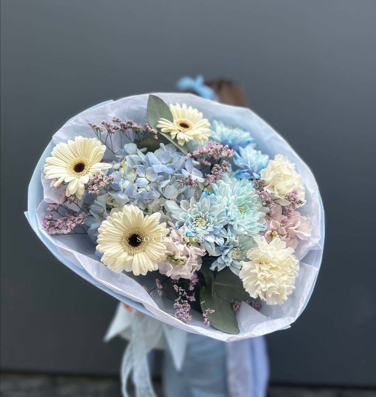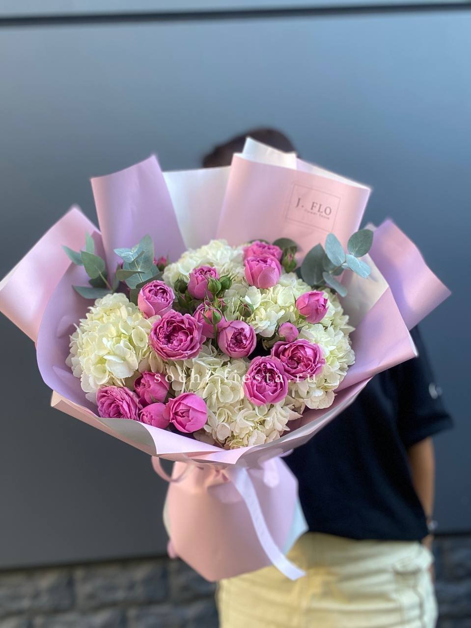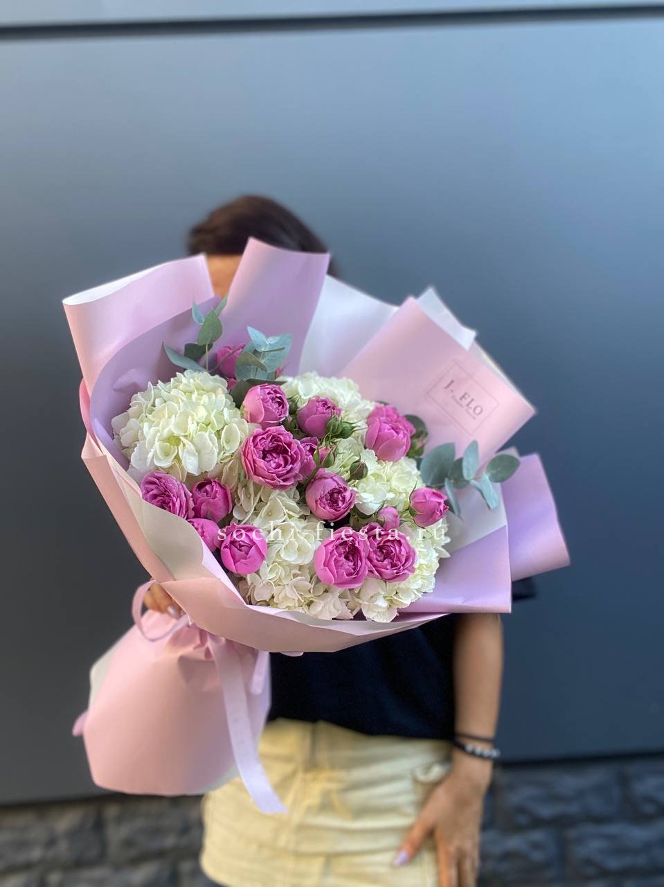 Лёгкая композиция с гортензией и гвоздикой дарит ощущение весеннего утра. Цветы подобраны так, что букет выглядит непринуждённо и свободно.