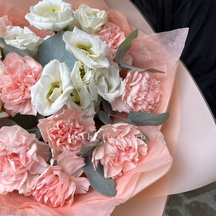 Пионы в сезон (май-июнь) — второй по популярности формат. Sarah Bernhardt, Coral Charm, Red Charm, Bowl of Cream. Моно-букет из 25 пионов или смешанная композиция с эустомой и гипсофилой.