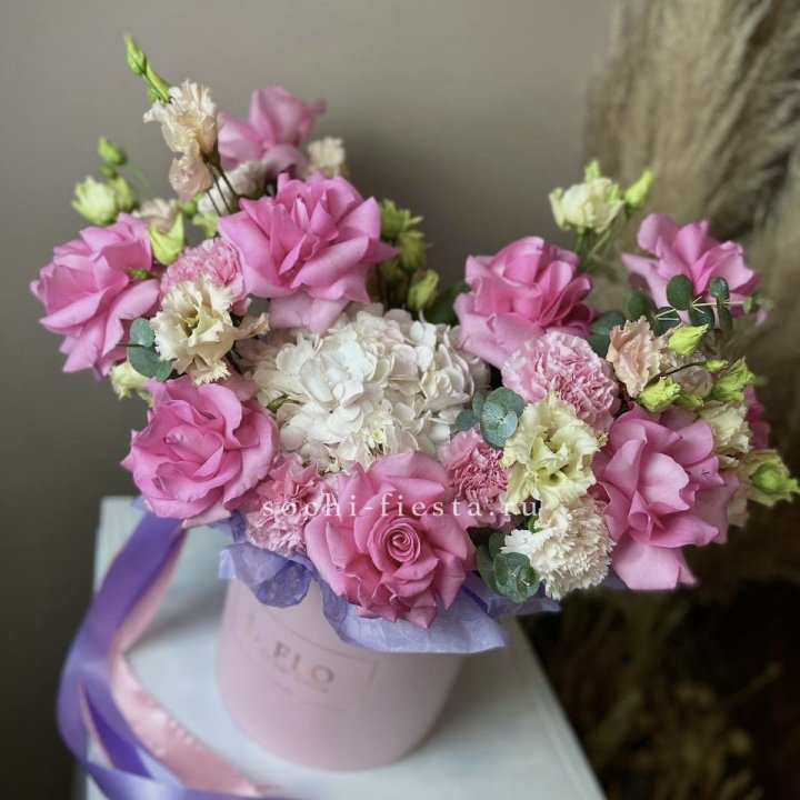 - Шляпная коробка с розами и гипсофилой — универсальный подарочный формат.