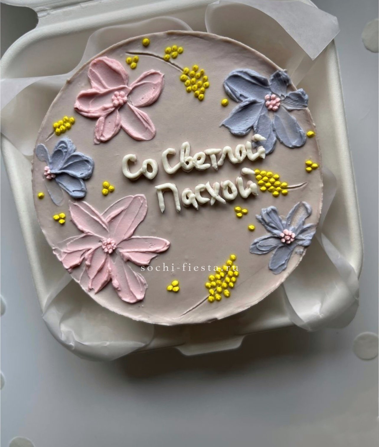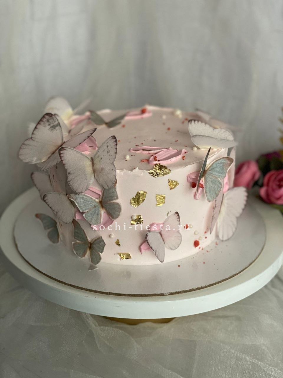Двухъярусная конструкция с плавным переходом оттенков от пудрового к насыщенному розовому. Гладкая поверхность крема контрастирует с объемными цветочными деталями. Ручная работа с выбором начинки.